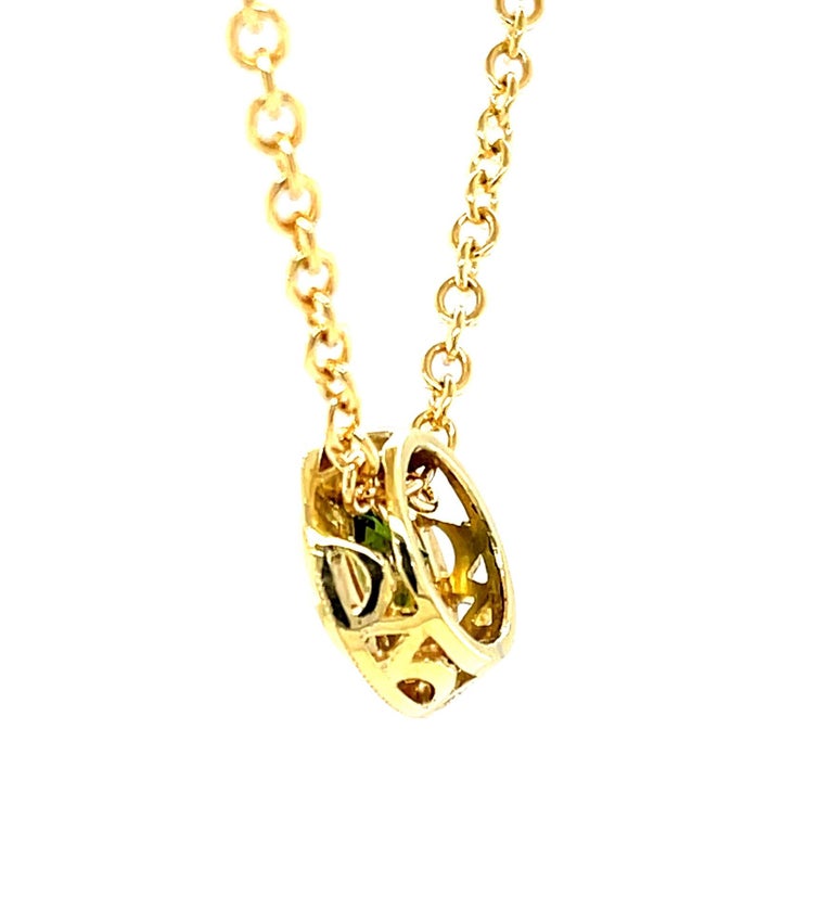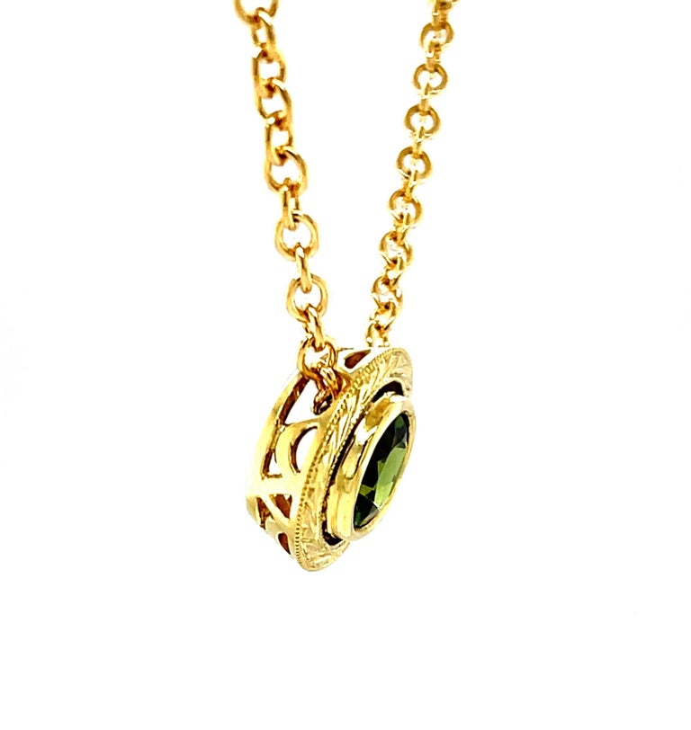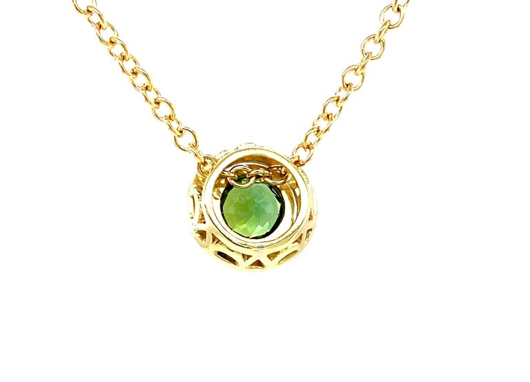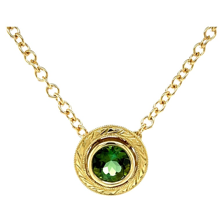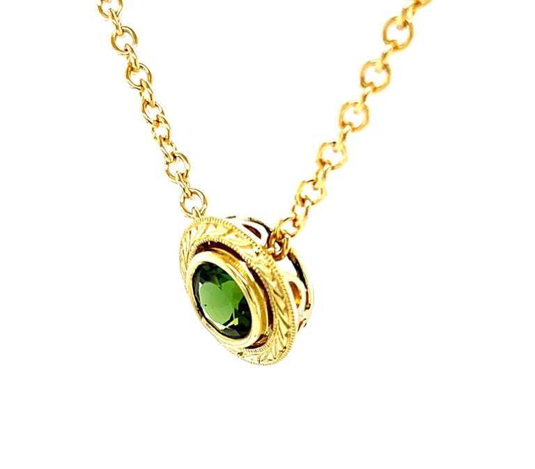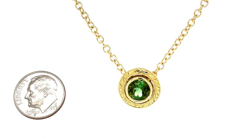 This brilliant, green-colored tourmaline sparkles brightly because it is so beautifully cut. It is large for a round shaped tourmaline, making it a striking center stone for a necklace. It is set in an 18k yellow gold bezel that has been intricately engraved by hand, and is suspended from an 18k yellow gold chain. Made in Los Angeles by our Master Jewelers with craftsmanship and attention to detail seldom seen today. So pretty!
