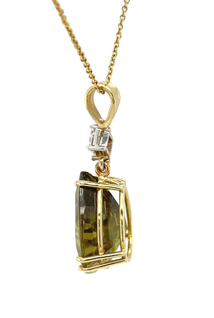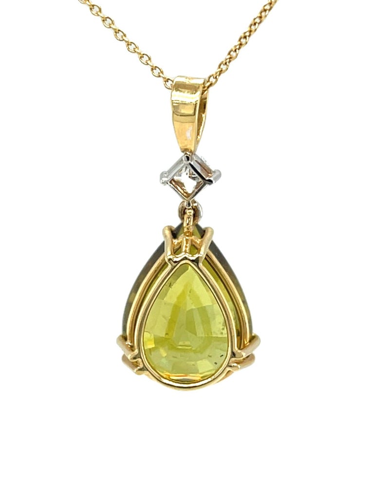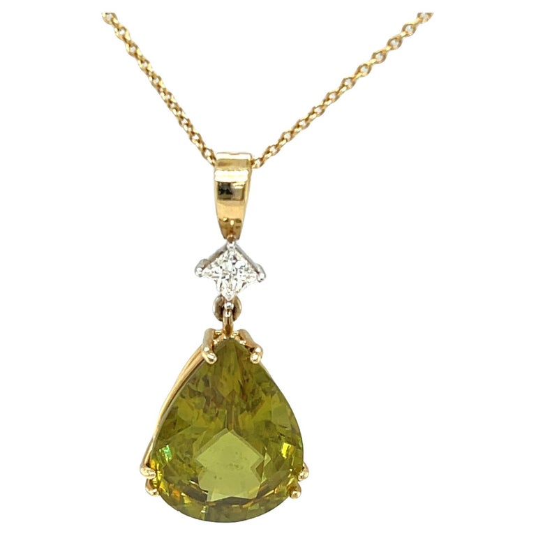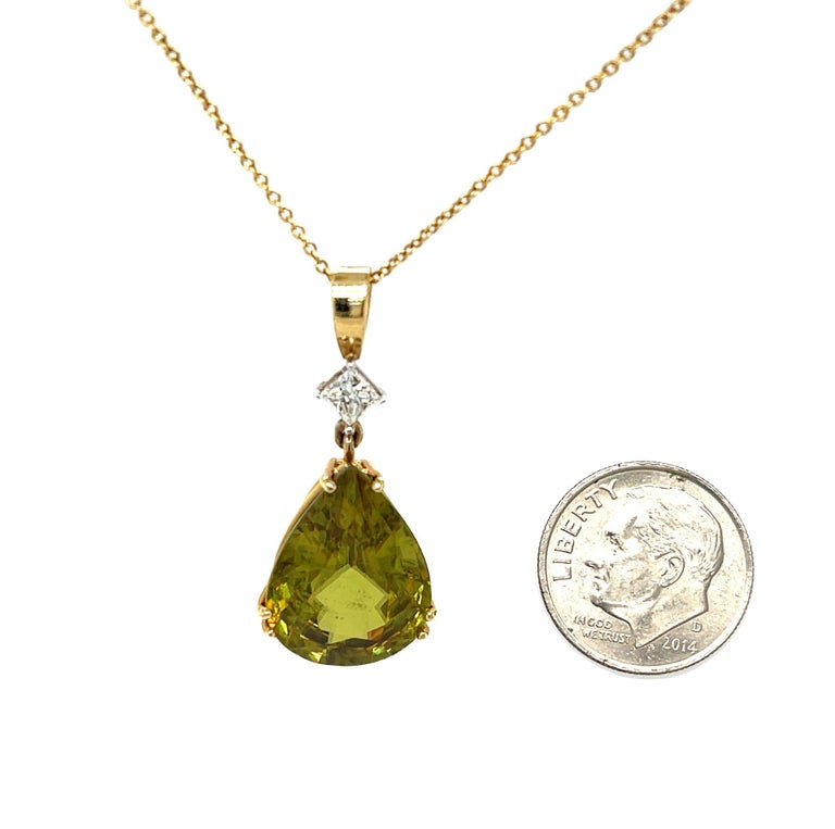 This stunning pendant features a rare 12.58 carat sphene gemstone. This pear-shaped natural gem is a collector's item. It is exceptionally large, weighing over 10 carats, and is of superfine quality. It possesses a bright olive green color with extraordinary dispersion that displays spectacular flashes of vivid yellow, orange and green. The gem also shows off characteristic "doubling" of its facets, beautifully illustrating another intriguing property of this unusual, crystalline gem. It is set in 18k yellow gold with a brilliant princess-cut diamond set in 18k white gold. This is an eye-catching and one-of-a-kind "collector" piece of fine jewelry that can be worn day or night and will complement your wardrobe throughout the year! Pendant measures 1-1/4" in length, including the bail. Chain sold separately.