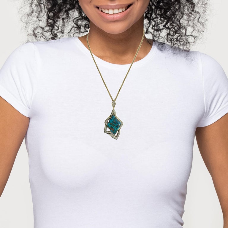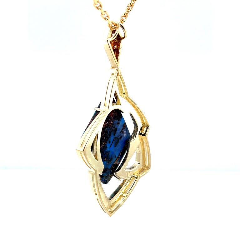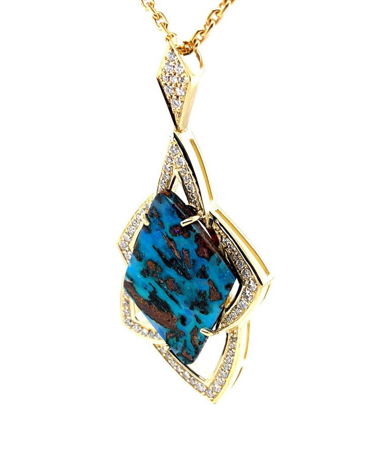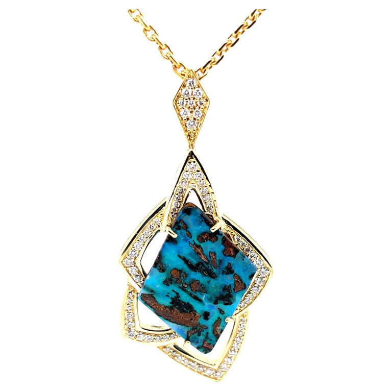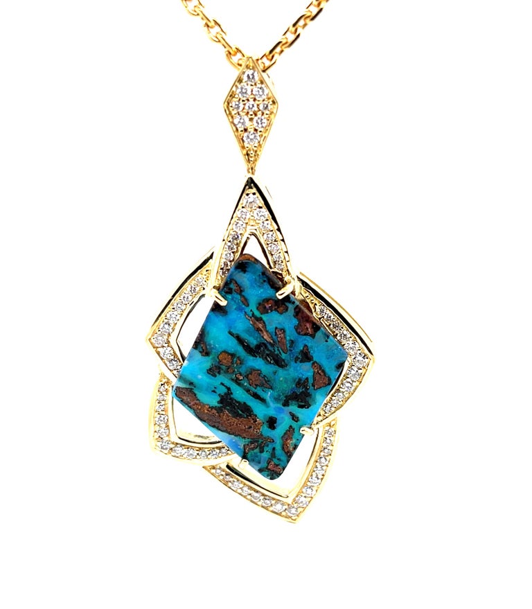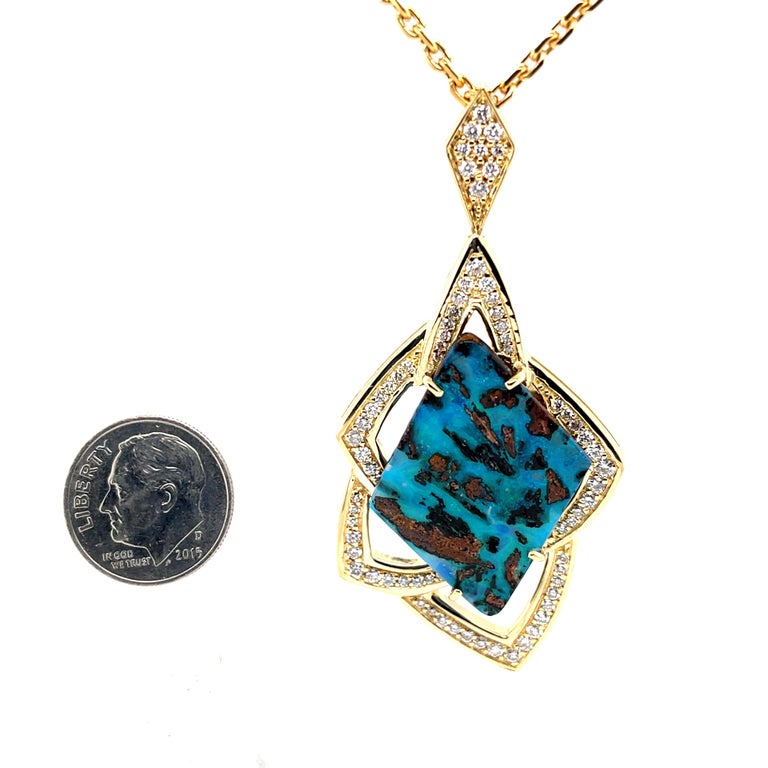 This one-of-a-kind pendant features a striking 15.67 carat boulder opal in an original Retro style design. The boulder opal has gorgeous turquoise blue body color and subtle play-of-color that displays both sparkling green and hints of lavender. The patterning of the matrix gives the piece a "blue leopard" appearance - so dramatic, especially set in our geometric freestyle design. Brilliant white diamonds elevate this statement piece and add to its wonderfully bold effect! Handcrafted in 18k yellow gold by our Master Jewelers in Los Angeles, pendant measures approximately 2.50 x 1.25 inches. Chain sold separately.