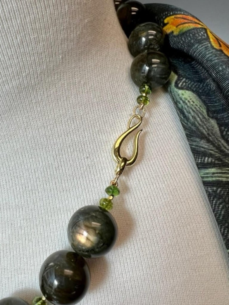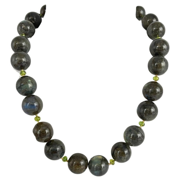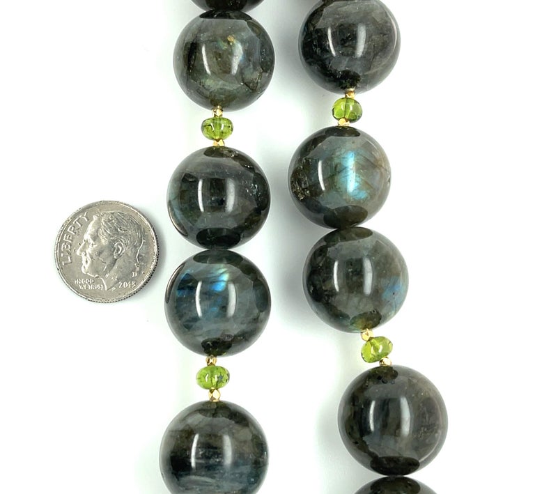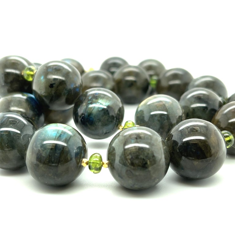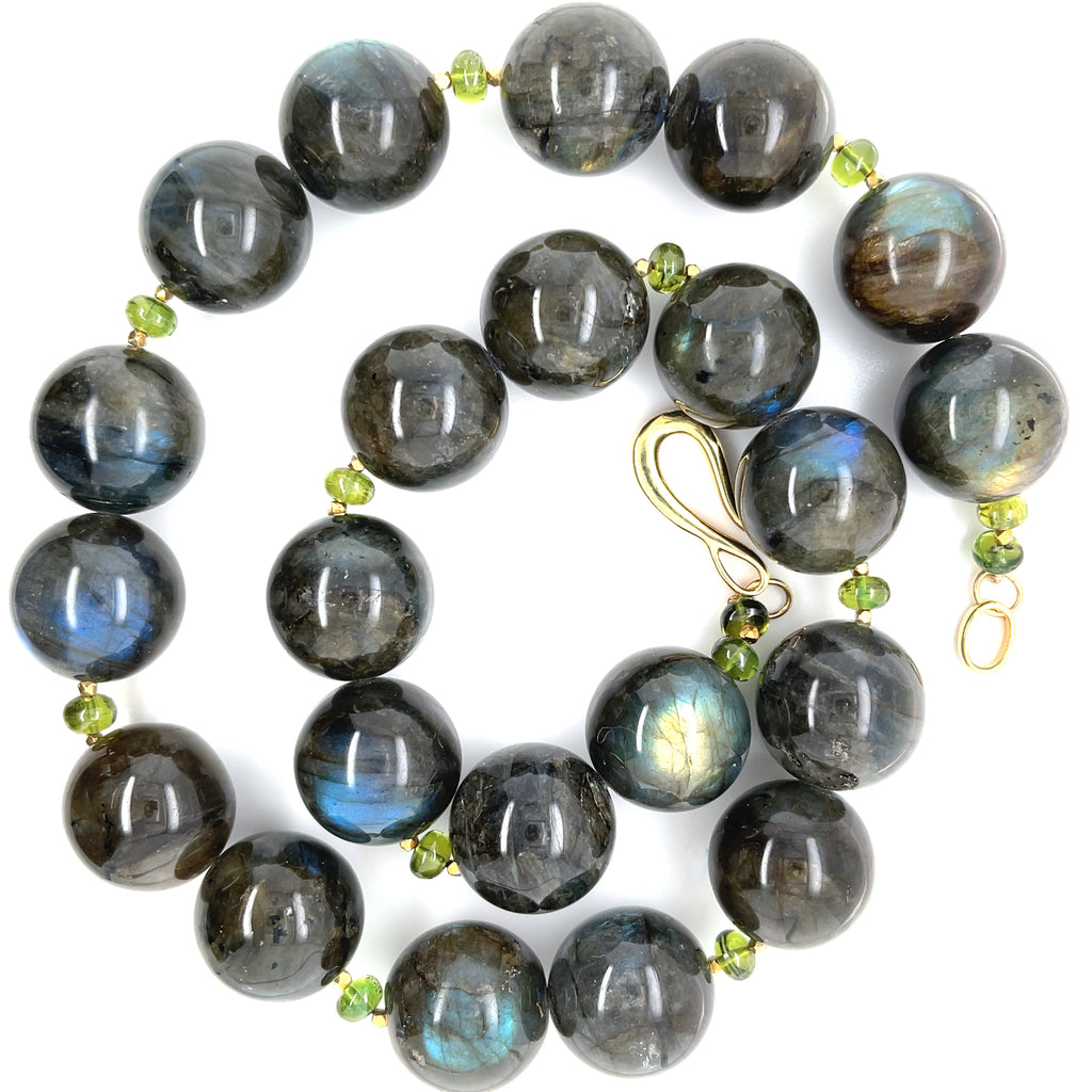 This eye-catching necklace features impressive 17mm round labradorite beads arranged with peridot beads and 18k yellow gold spaces for a unique look that can enhance many different outfits! The labradorite beads have a beautifully warm, earthy gray body color with bright flashes of electric blues, bright greens, yellow, and pastel orange. Finished with an 18k yellow gold, custom clasp that elevates his strand for a true fine jewelry look. One-of-a-kind and organic, but also elegant and sophisticated for evening wear!