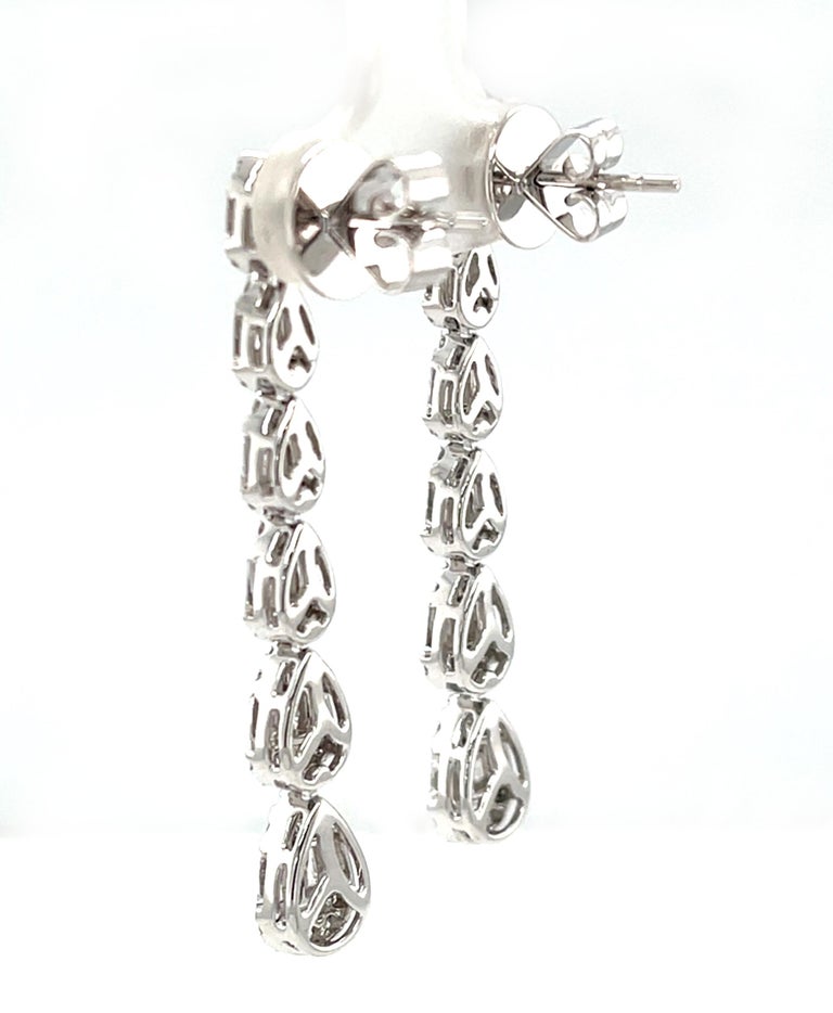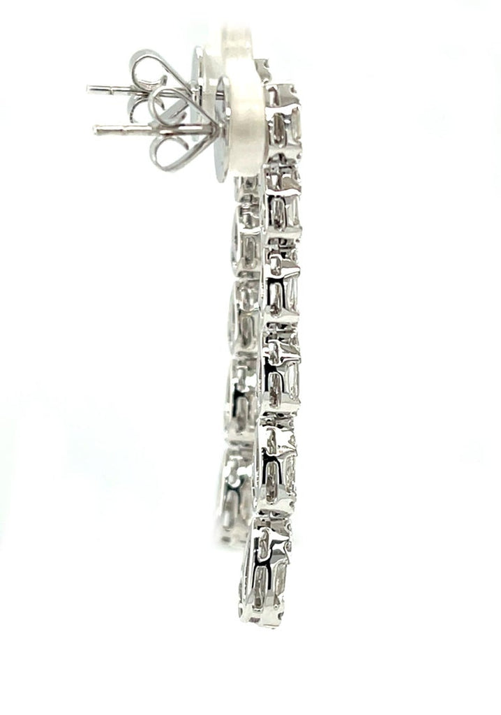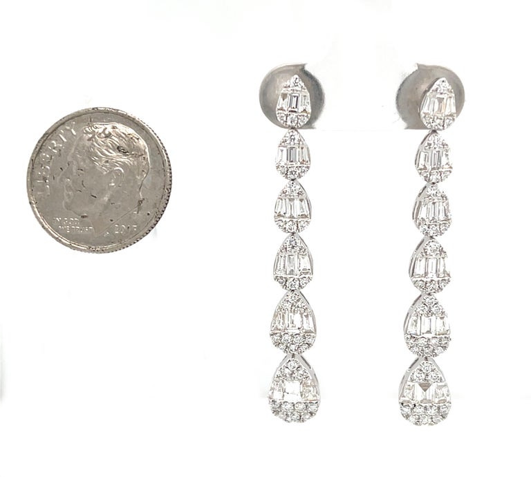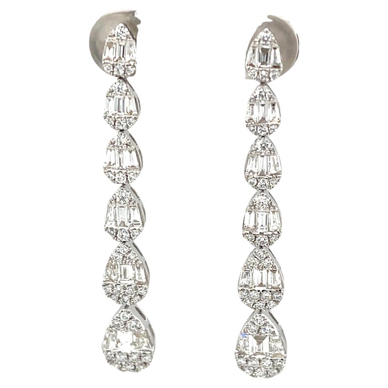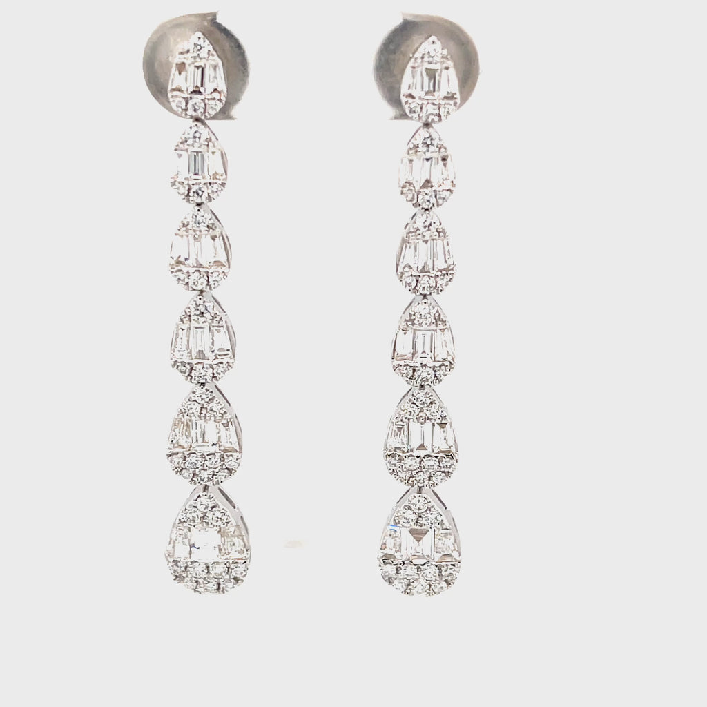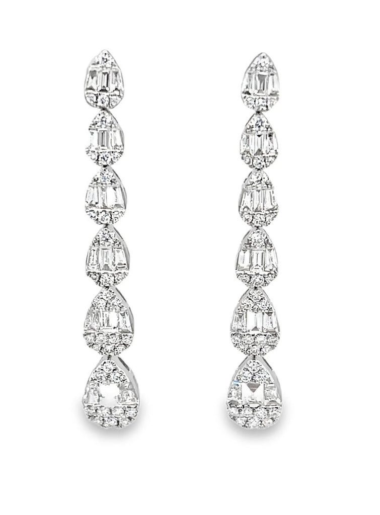 These stunning dangle earrings feature over 2 carats of baguette and round diamonds, beautifully arranged to form cascading pear shapes in an elegant and sophisticated design that is perfect for special occasions. The combination of baguette and round diamonds give these earrings a luxurious, timeless feel, and the elegant movement makes them even more eye-catching. Earrings measure 1-3/4" in length and are crafted in beautiful 18k white gold. Gorgeous "go to" earrings that are sure to become a signature favorite in your fine jewelry collection!