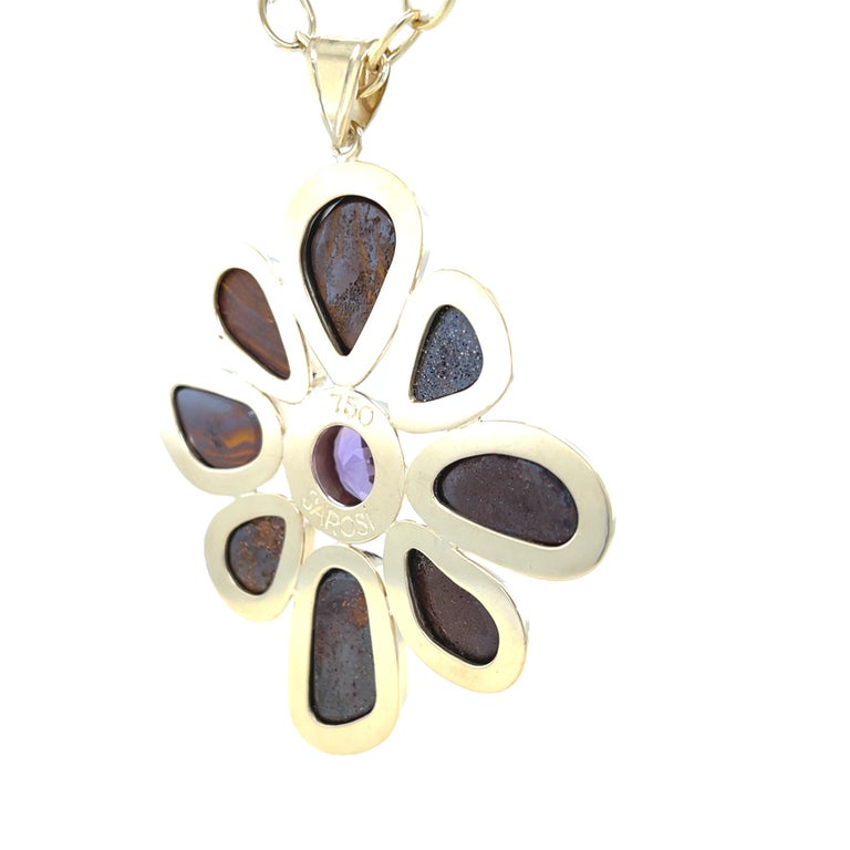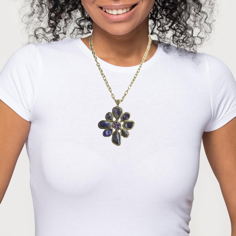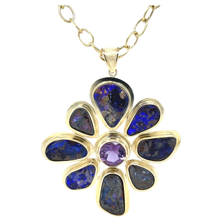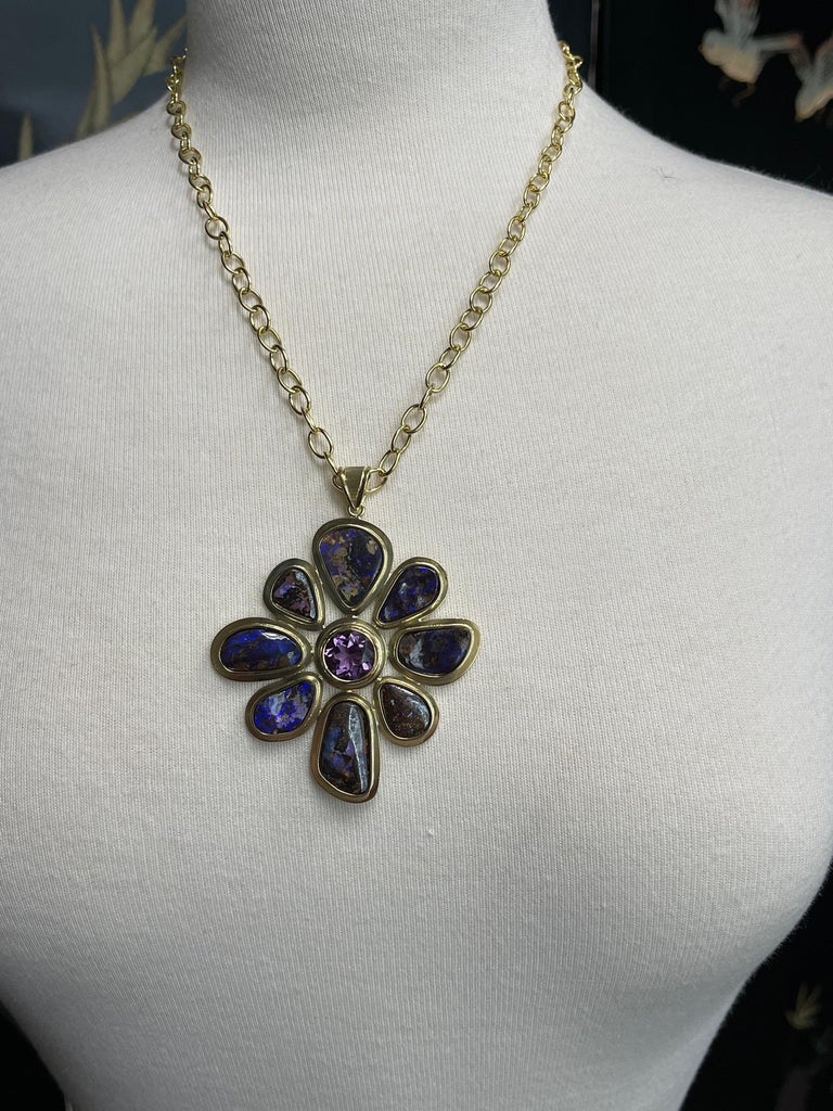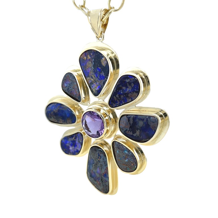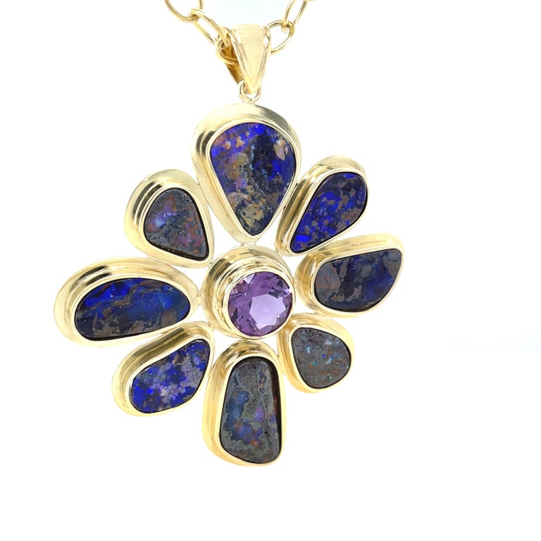 This gorgeous handmade pendant features eight impressive boulder opals, beautifully arranged around a bright, 5.48 carat round amethyst! The opals have stunning electric royal blue and purplish blue hues that stand out against rich, coffee-colored matrix. Lovely hints of turquoise and lavender add bright highlights and complement the pinkish purple color of the central amethyst. Each gem is set a striking 18k yellow gold bezel and frame, handcrafted by our Master Jewelers in Los Angeles. An exquisitely hand-textured bail finishes this stunning, one-of-a-kind statement piece that is sure to turn heads! Handmade 18k yellow gold chain sold separately.