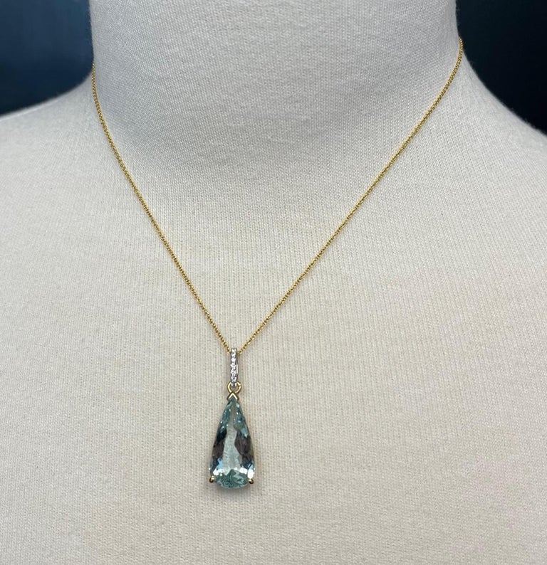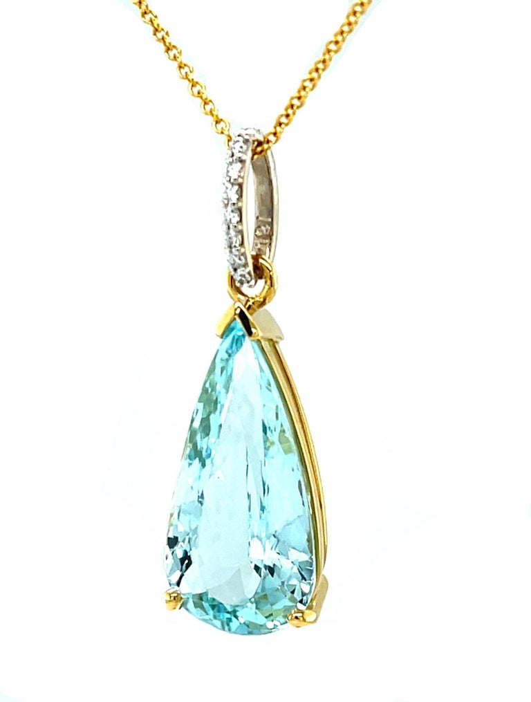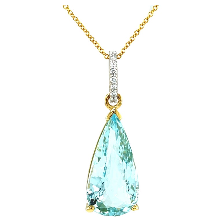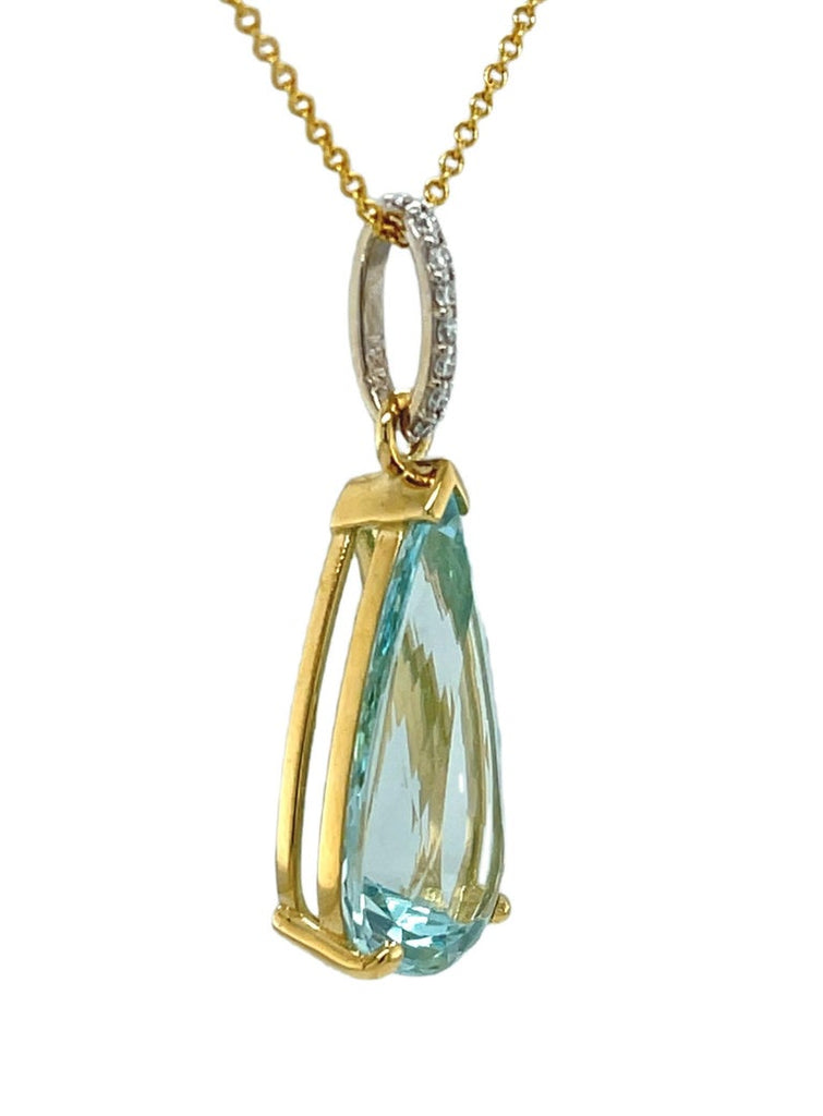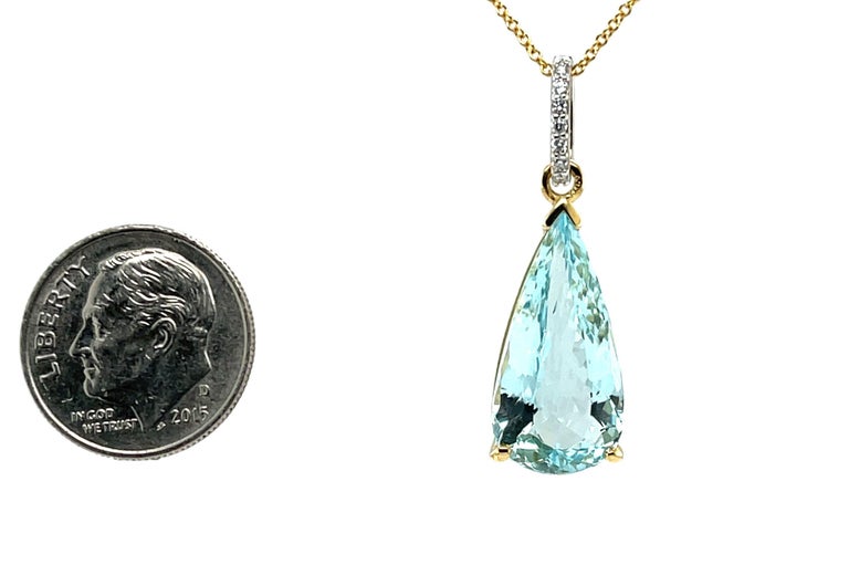 This gorgeous aquamarine and diamond necklace features an impressive 7.07 carat pear-shaped aquamarine set in 18k yellow gold. The aquamarine is a beautifully crystalline gem with bright blue color and exceptional brilliance. Accented with a delicate 18k white gold bail that has been pave-set with sparkling white diamonds, this necklace is smart and sophisticated for daytime wear, as well as eye-catching and luxuriously suited for evenings and special occasions! Handcrafted in 18k white and yellow gold by our Master Jewelers in Los Angeles - an exquisite (and timeless) addition to your fine jewelry wardrobe! Pendant measures 1-1/4" in length. Chain sold separately.