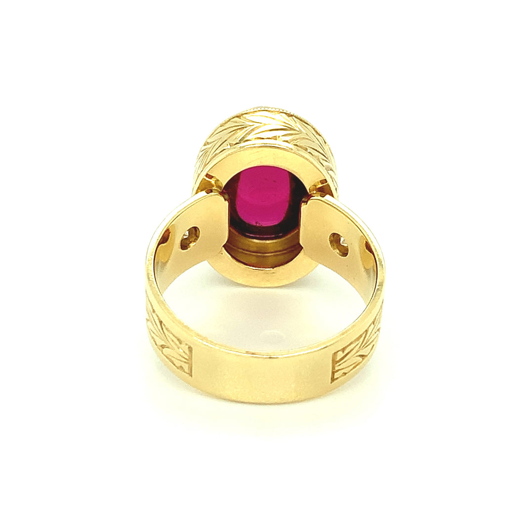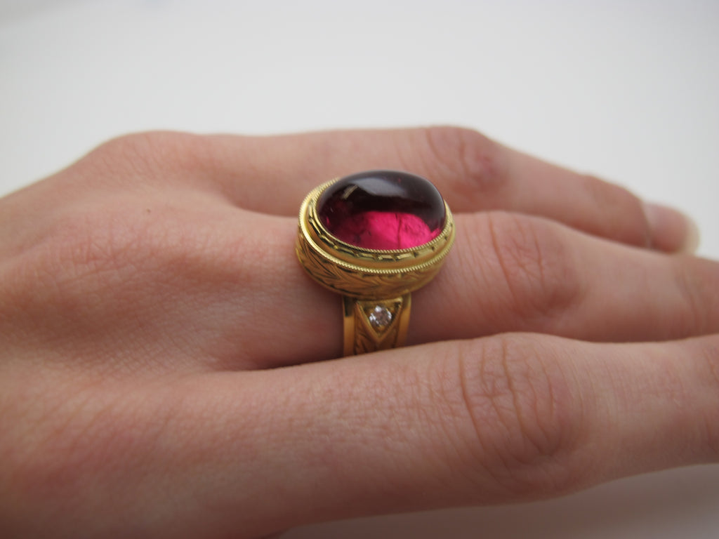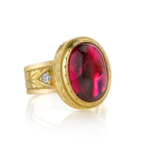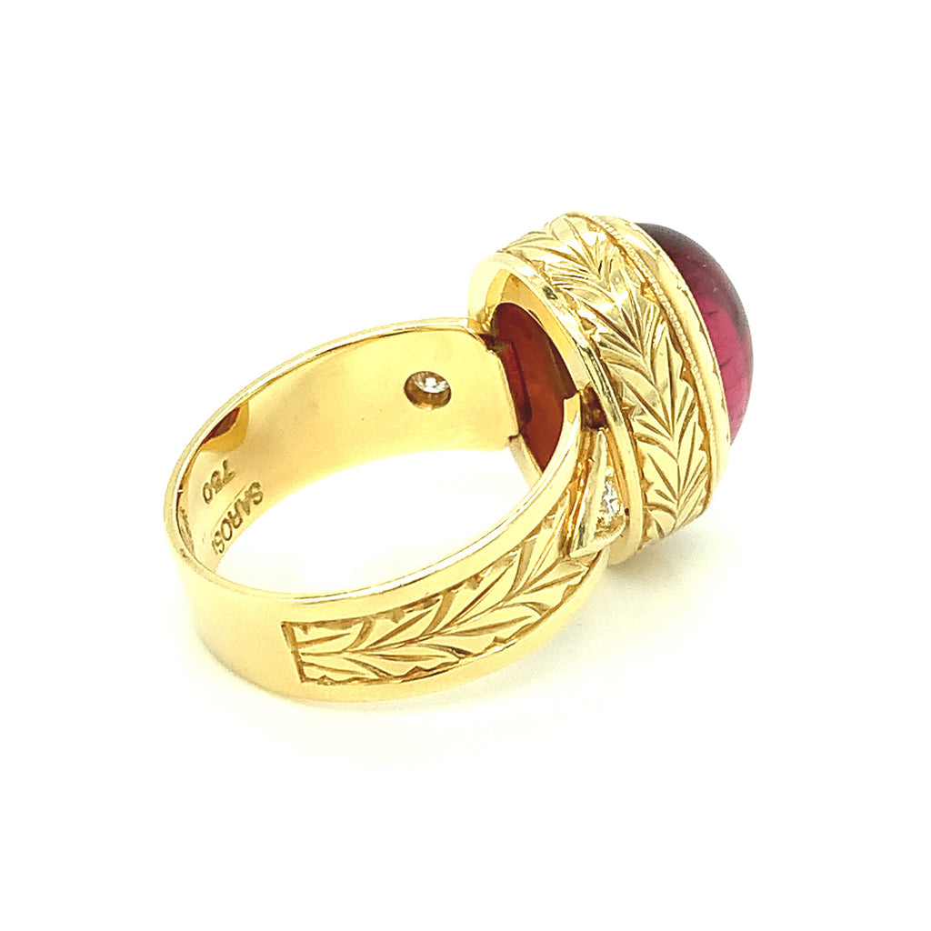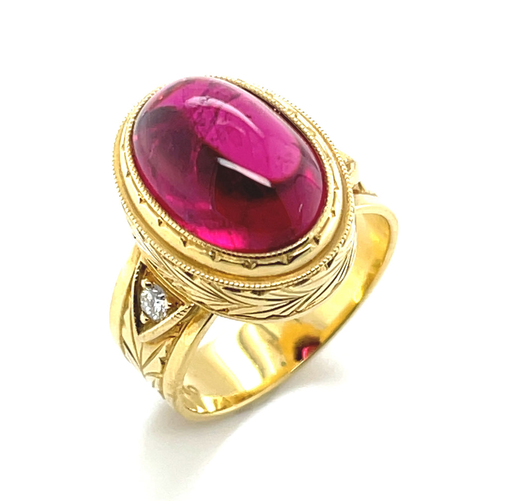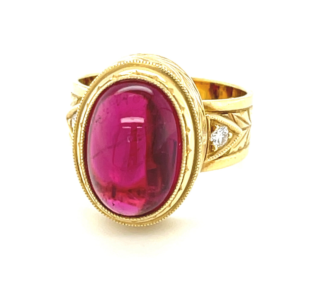 This 18k yellow gold handmade ring features a beautifully crystalline rubellite tourmaline cabochon with gorgeous raspberry color and excellent clarity. Our signature ring style was designed to showcase a main gemstone of noteworthy quality by setting it in an intricately engraved, multi-dimensional bezel that is beautiful from every angle. A brilliant white diamond on either side of the center stone adds extra sparkle, and the sides of the band have been engraved with an elegant leaf pattern by our Master Jeweler in Los Angeles. This design is a tribute to quality gems and artisan skill that is rarely seen today. Such a bright and uplifting color - the perfect way to update your fine jewelry wardrobe!
