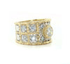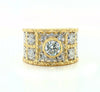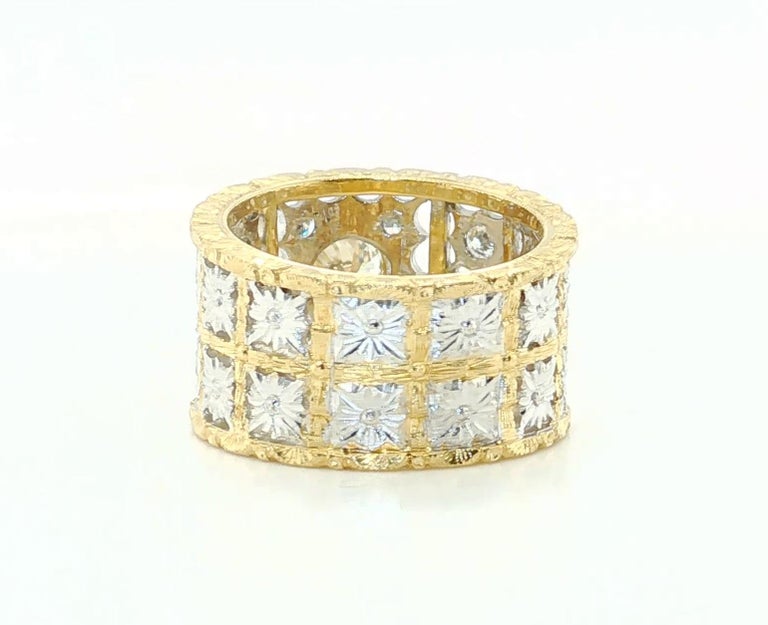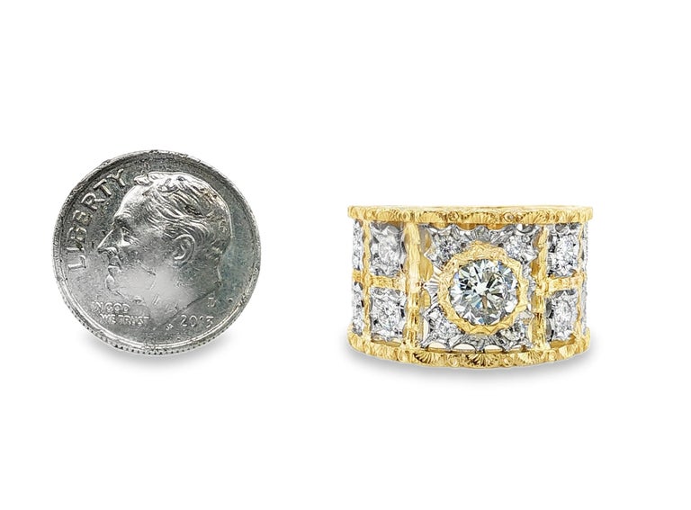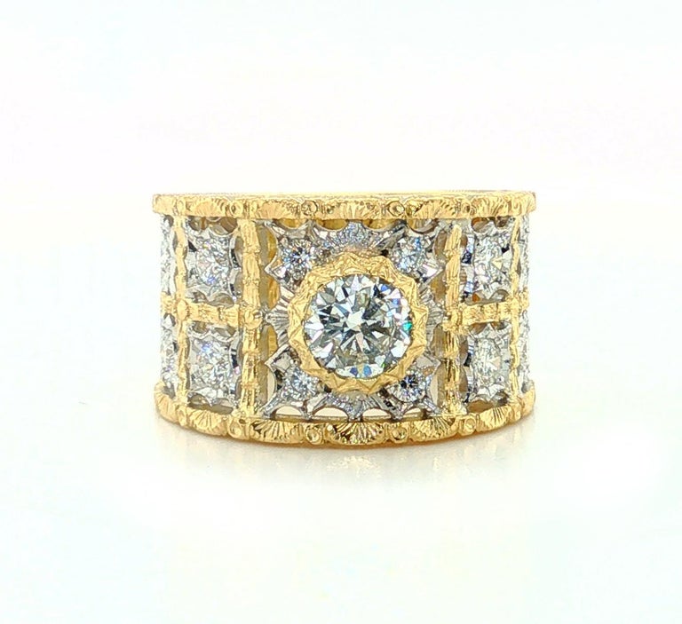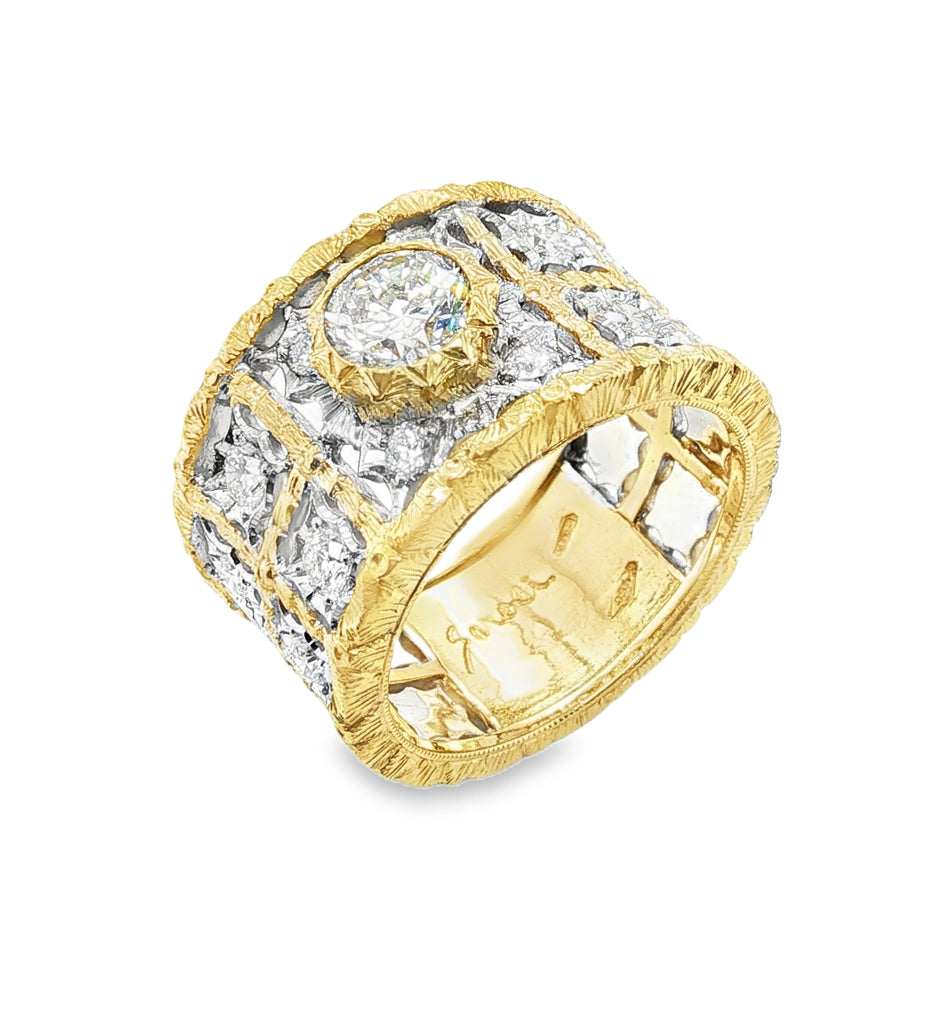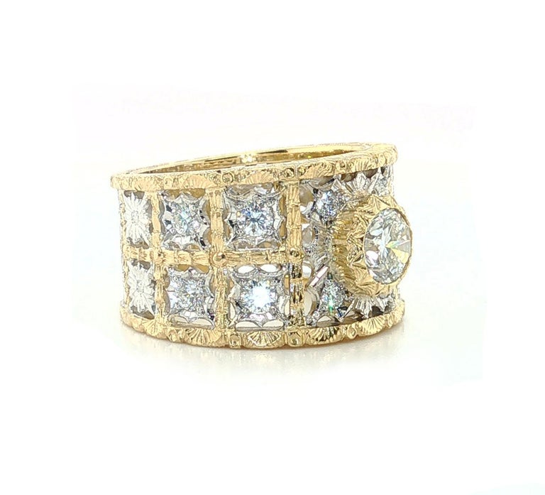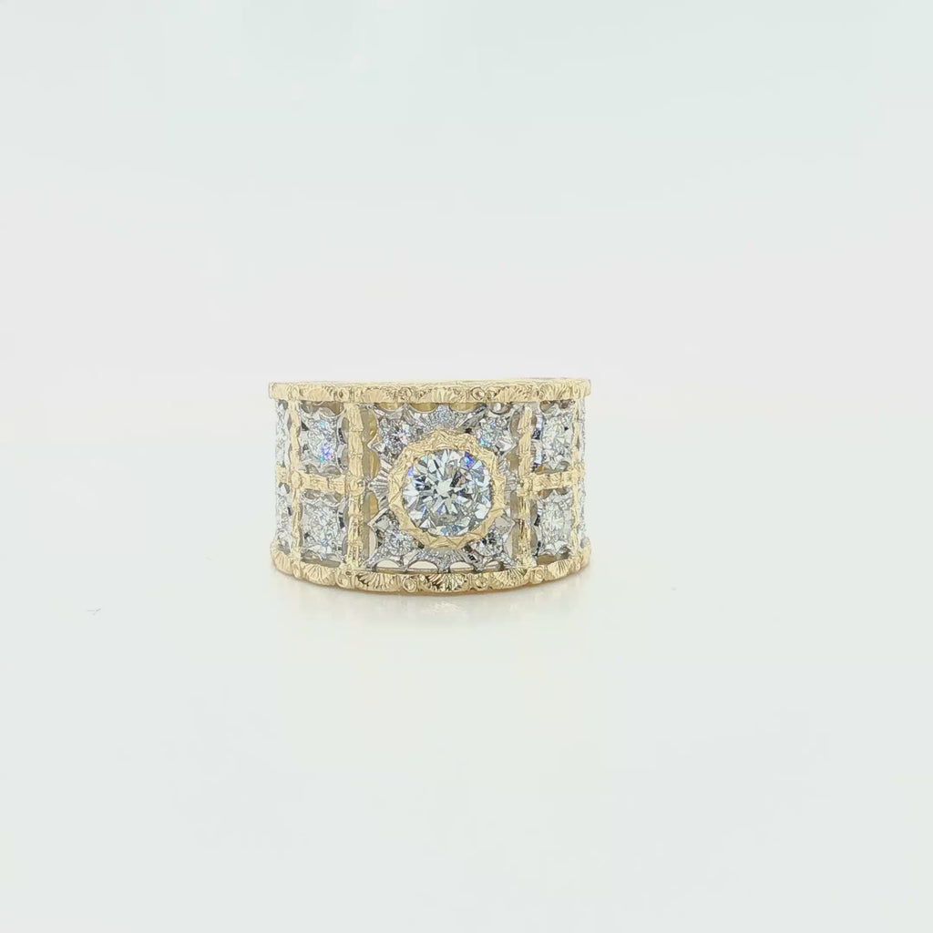 This spectacular band features a natural .76 carat GIA certified diamond set in our beautifully handcrafted Italian Florentine style ring. The diamond is set in an 18k yellow gold bezel adorned with exquisite, hand-done detail. Intricate 18k white gold settings are laced together and hold over a carat in sparkling white diamonds that encircle the entire band. Finely engraved 18k yellow gold adds contrast, texture, and elevate the luxurious look and feel of this ring. In a time when the use of technology is becoming increasingly prevalent, this is a ring whose quality and appearance can be achieved only by the experienced and talented hands of master craftsmen. Breathtaking from every angle, this is a truly work of art that is perfect for both everyday and special occasions.