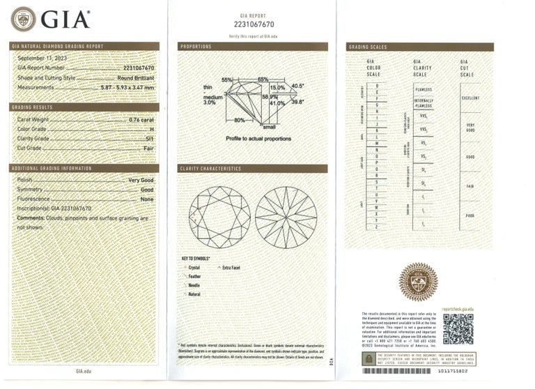 GIA Natural Diamond Grading Report certifies the .76 diamond as H/SI-1