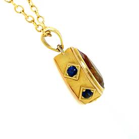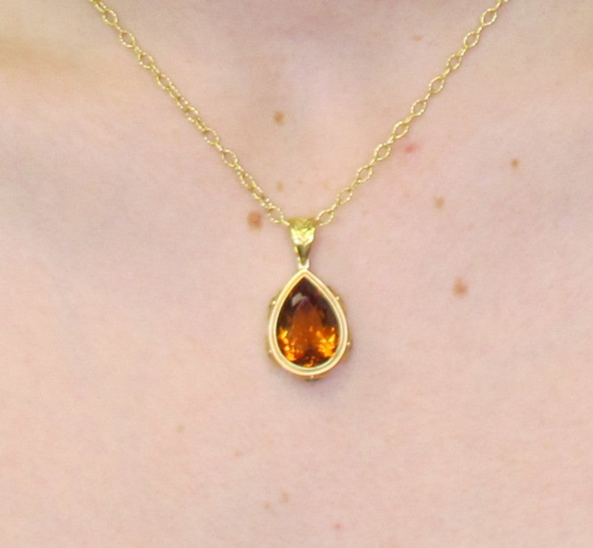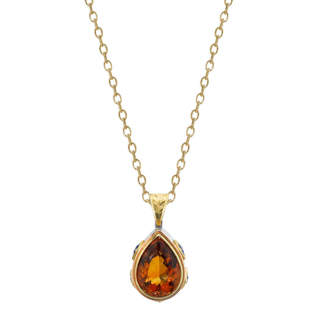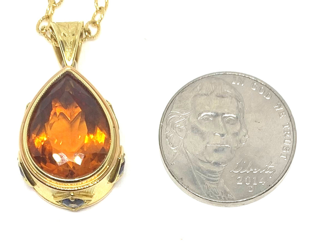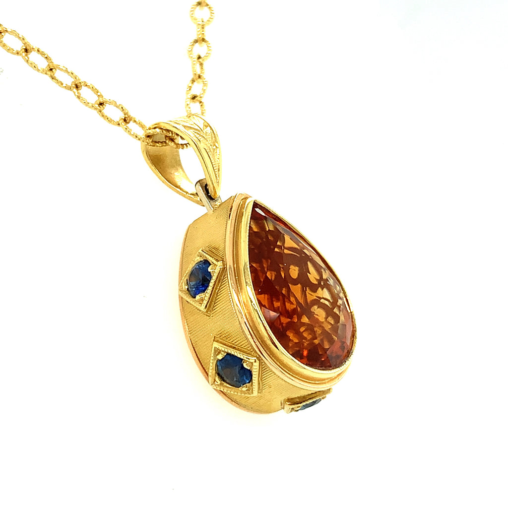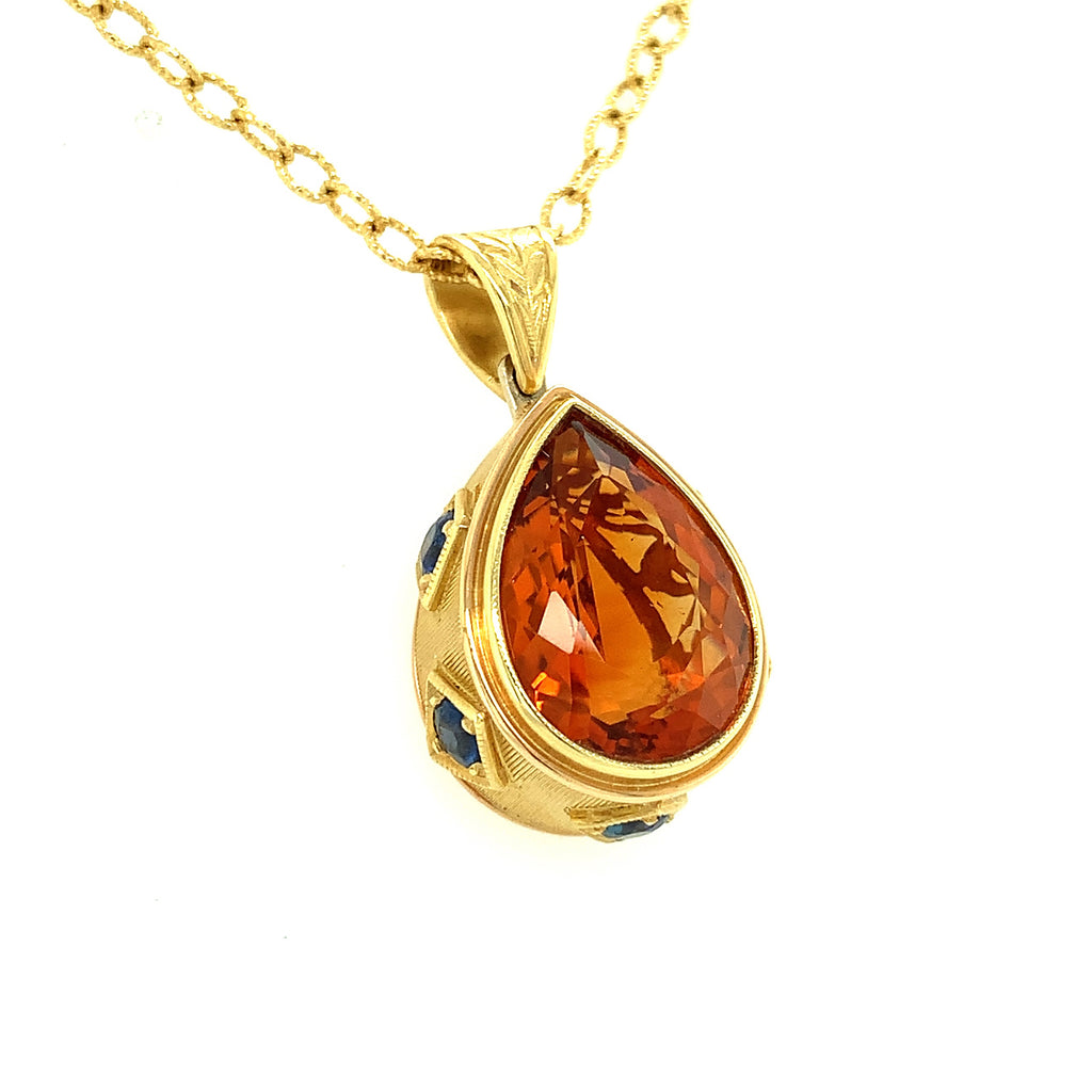 A rich, golden citrine pear and deep blue sapphires come together in this beautiful 18k pendant drop that has the presence and feel of an earlier time. The luscious citrine drop suspends from an elegant, engraved bail and commands attention in an understated expression of confidence and style. This setting was made by our Master Jewelers in Los Angeles using craftsmanship and attention to detail seldom seen today. 14k yellow gold chain included.