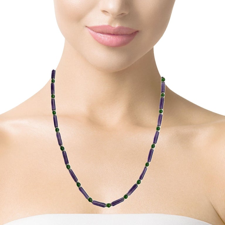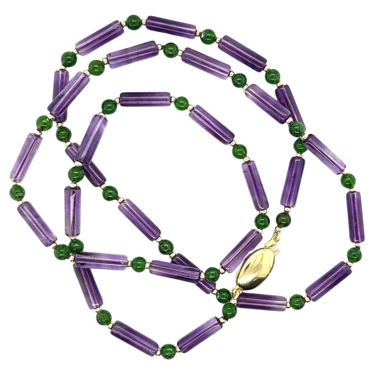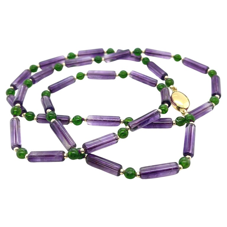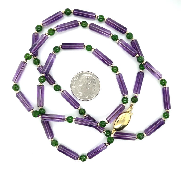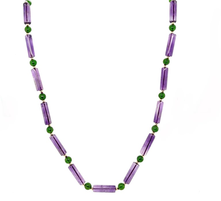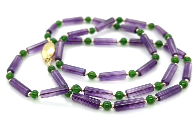 Lovely purple amethyst is paired with bright chrome diopside in this colorful beaded necklace that can be easily dressed up or down! The slender amethyst have beautiful color, and their elegant shape provides a gorgeous contrast to the rich green chrome diopside rounds. High-polished 14k yellow gold accent beads and the oval clasp add eye-catching sparkle and elevate the necklace to fine jewelry status. The necklace measures 24.5" in length - what a perfectly versatile way to add color and style to both casual days and dressy evenings!