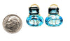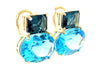 These French clip earrings feature over 28 carats of stunning Swiss blue and London blue topaz set in handcrafted 18k yellow gold earrings. The richly colored emerald-cut London blue topaz weigh 5.30 carats total and are set horizontally above large, bright Swiss blue topaz ovals that weigh 23.19 carats combined. The two shades of blue are striking next to each other in these earrings that will complement both daytime casual and dressy evening wear beautifully. One-of-a-kind earrings made by our Master Jewelers in Los Angeles. An elegant way to add color to your fine jewelry wardrobe!