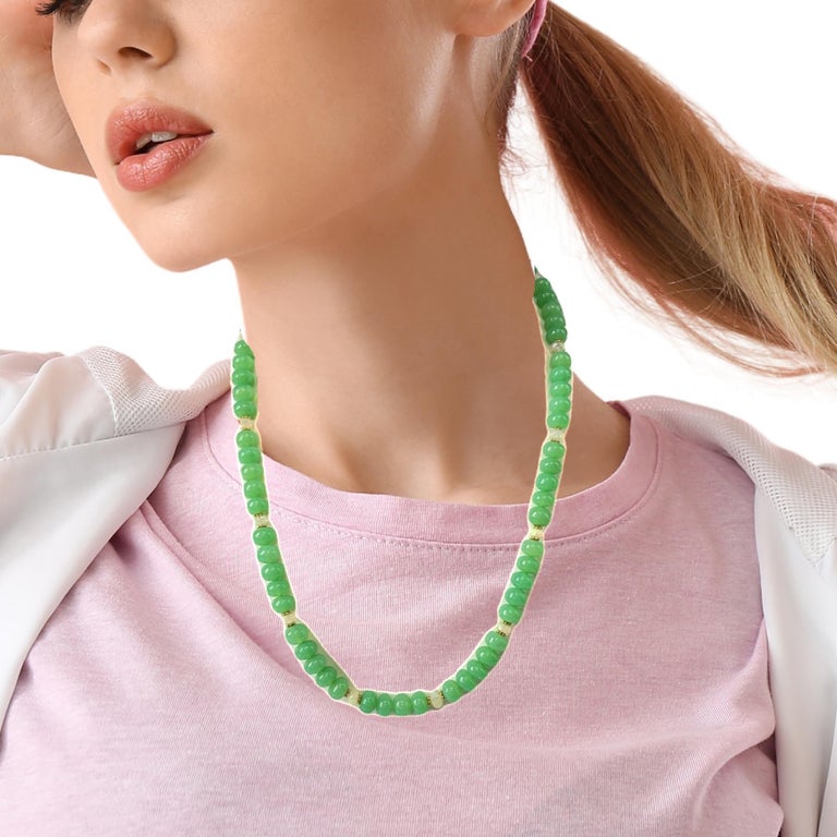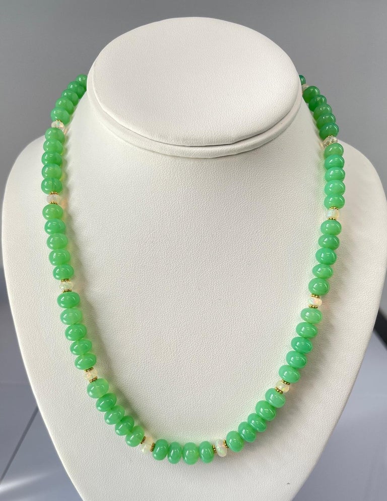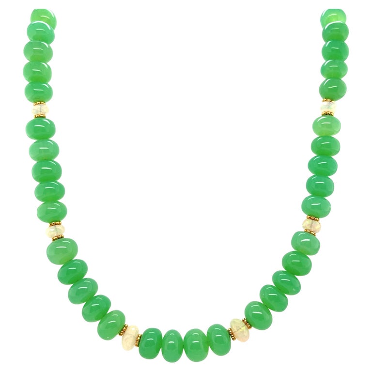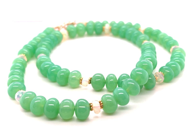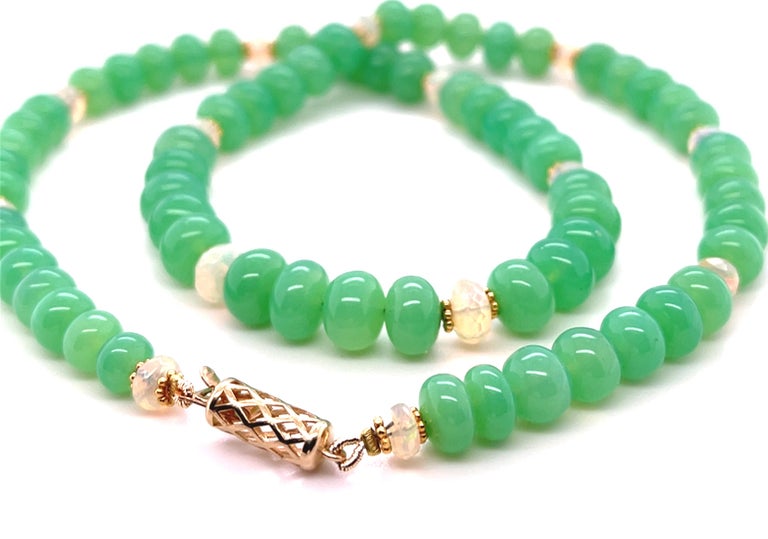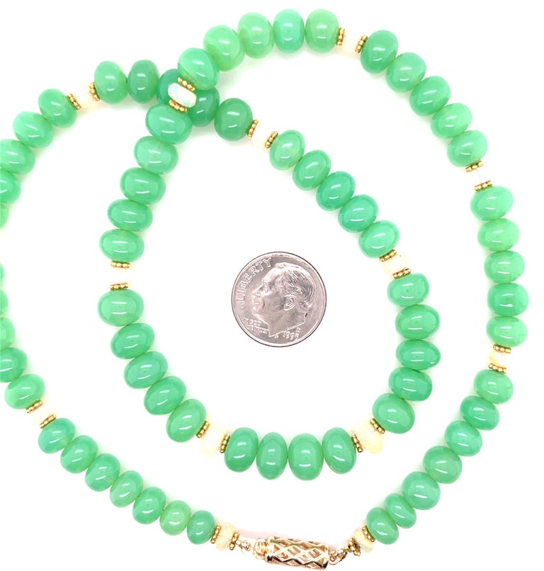 This beautiful necklace features translucent green chrysoprase gems arranged with faceted opal beads and 18k yellow gold accents. The rondel-shaped chrysoprase have such unique, gorgeous color and graduate in size from 6mm to 8mm in diameter. The faceted opal beads are near-transparent and are the perfect complement to the bright spring green color of the chrysoprase. 18k yellow gold accent beads and a pretty 14k yellow gold basket weave clasp bring the necklace to a finished length of 19-1/4". What an original way to add color to your everyday and special occasion wardrobe!
