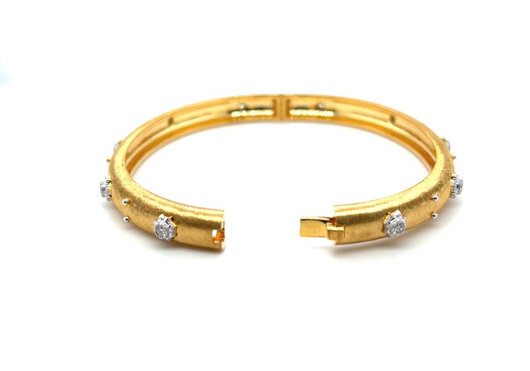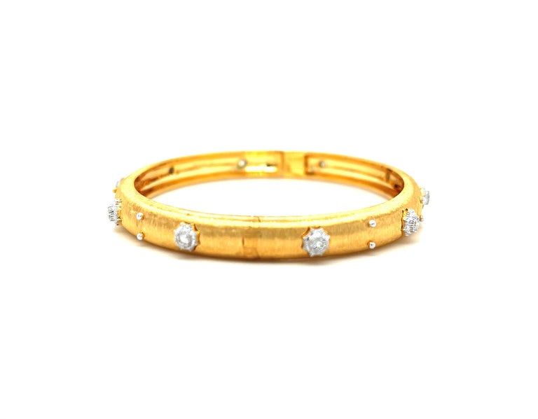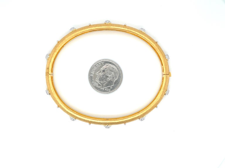 This elegant, 18k yellow gold bangle bracelet is really eye-catching! The bangle is finely textured with a beautiful satin finish, and is set with 14 sparkling white diamonds! Each diamond is set in its own 18k white gold, intricately detailed "starburst" setting that makes it really stand out. Delicate white gold beads add the perfect finishing touch to this bangle that is perfect for both daytime and evening wear. This bangle measures approximately (46x57mm) The perfect gift to make someone feel really special!