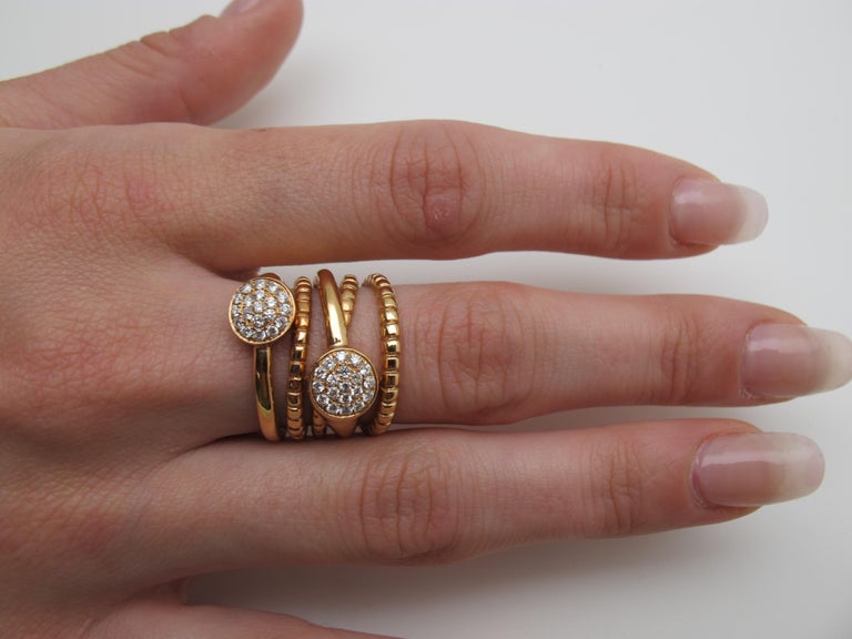 This stylish criss-cross ring is a lovely statement of never-ending devotion! Diamond studded rose gold discs sparkle in a unique combination of textured and highly polished rose gold bands. A real signature piece styled for every day wear. This ring would make a perfect gift for you or a loved one.