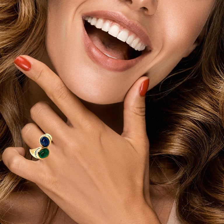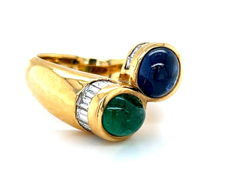 This handsome ring features a beautiful blue sapphire cabochon paired with a bright green emerald cabochon set with sparkling baguette-cut diamonds in 18k yellow gold. The blue sapphire is nearly transparent with rich medium blue color, while the emerald has gorgeous color, also with beautiful transparency. Over a carat of white diamond baguettes are channel set around the bezel-set colored gems in a contemporary wraparound design that is stunning from all sides. The sapphire and emerald are set at eye-catching angles and the rounded, tapering band makes this ring comfortable on any finger! An understated and luxurious ring that is perfect for daytime and evening wear!