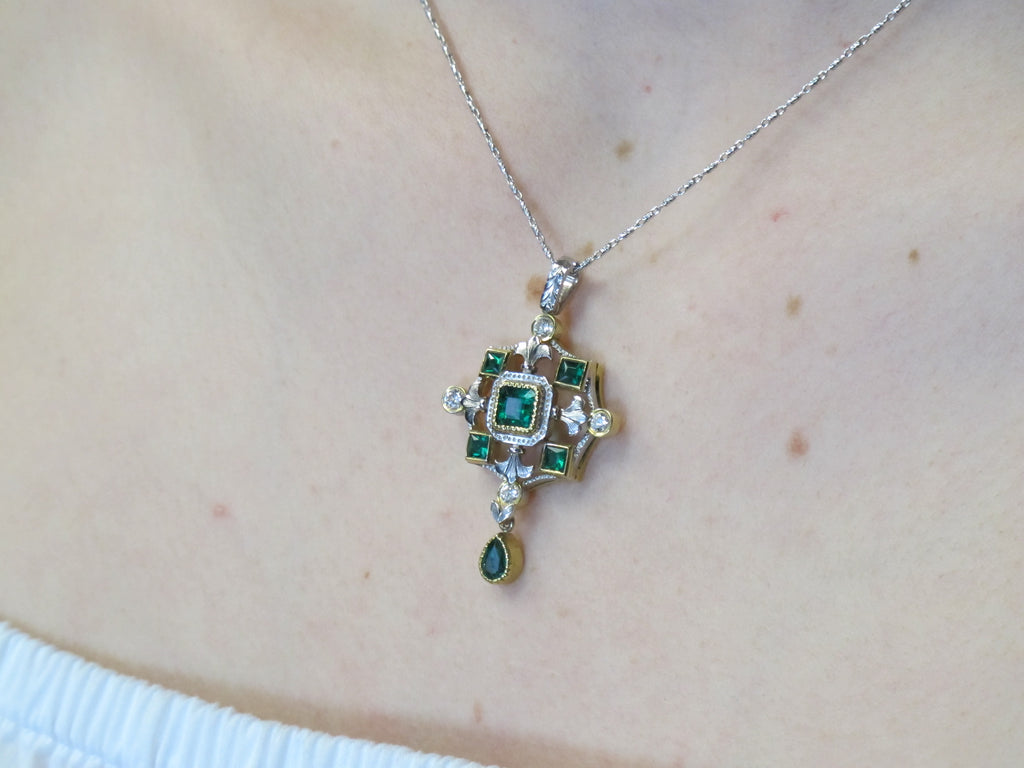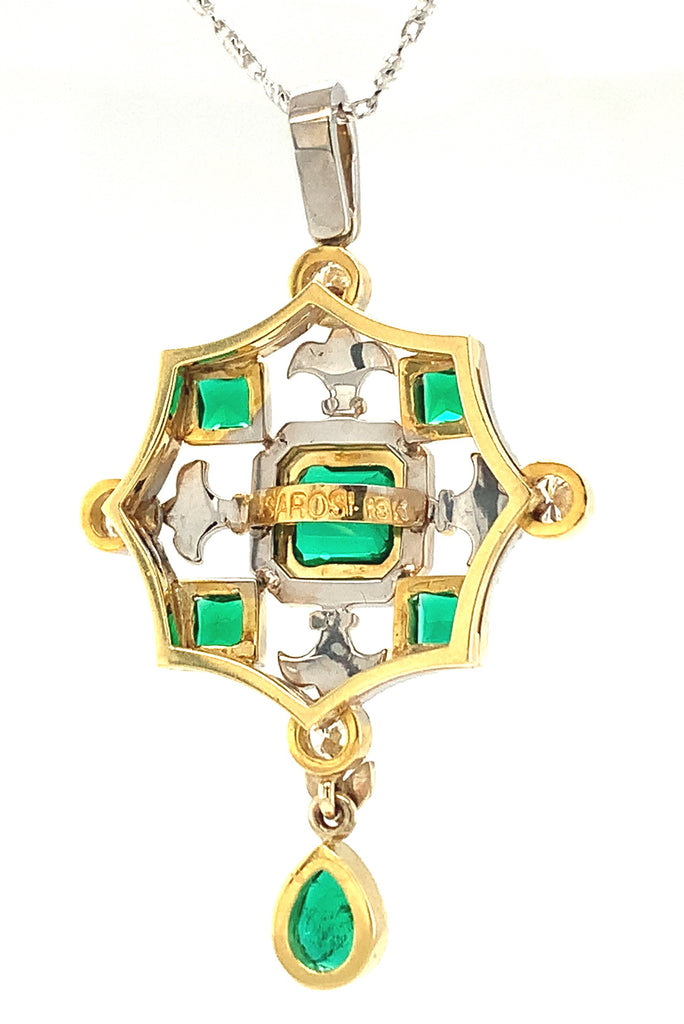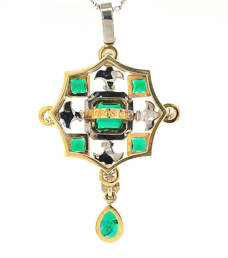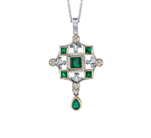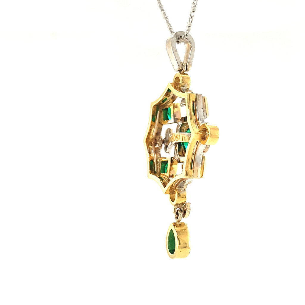 Rich, deep green emeralds in fancy square and pear shapes are set in this elegant pendant. It was handcrafted in 18k yellow and white gold with diamond accents by our Master Jewelers in Los Angeles. The level of craftsmanship and attention to detail displayed in this custom-made piece is seldom seen today. A nod to timeless Renaissance designs! 18k white gold chain included.