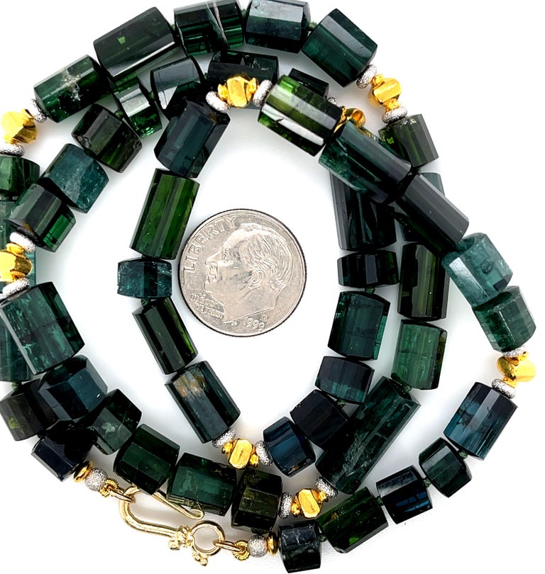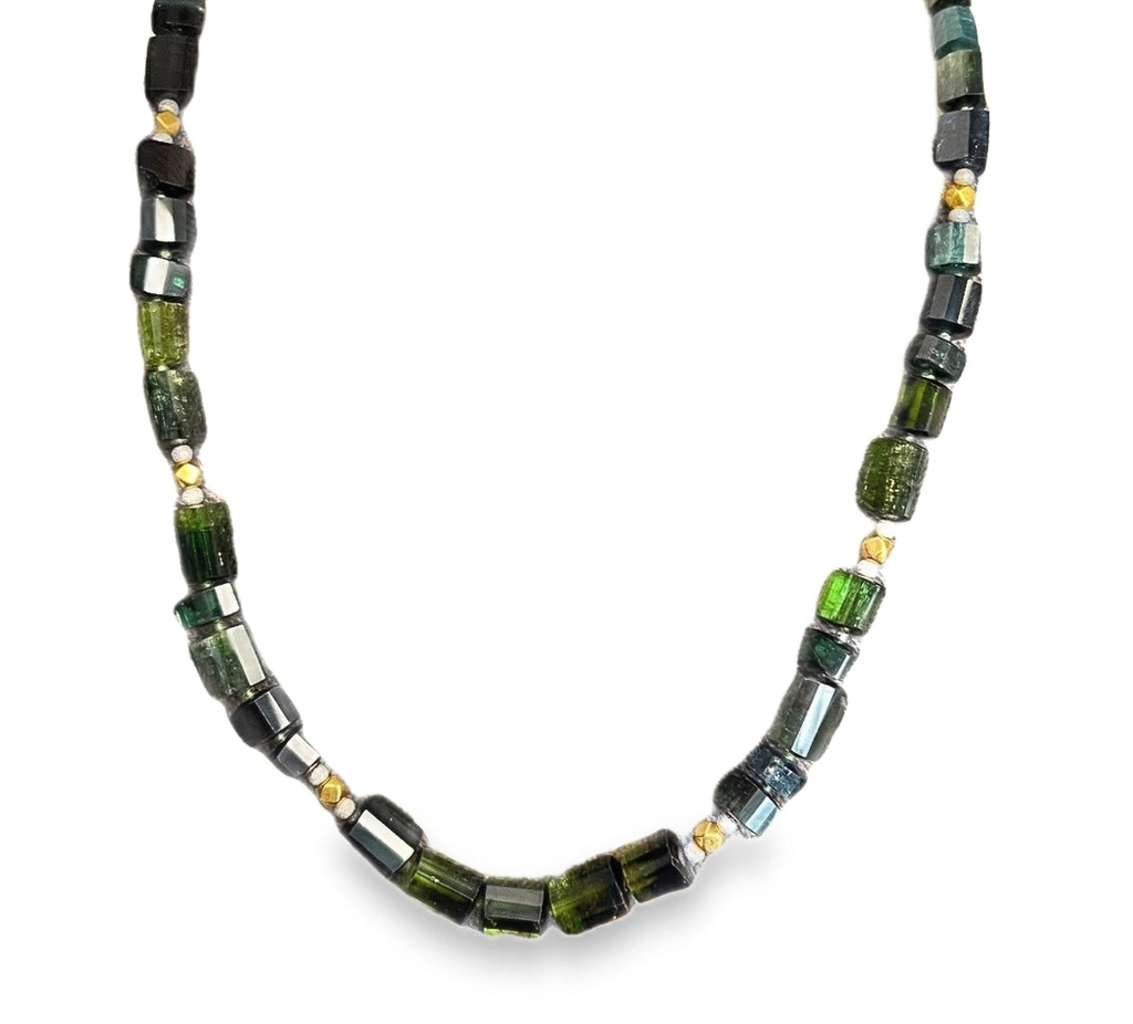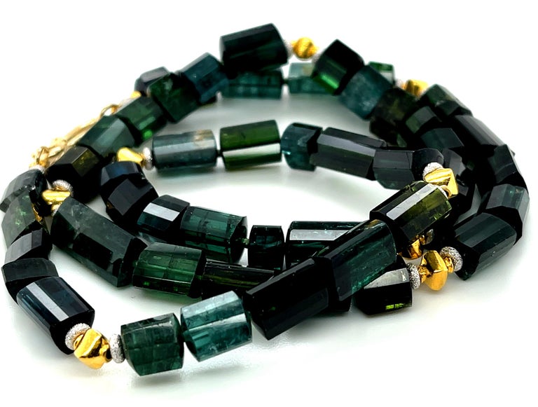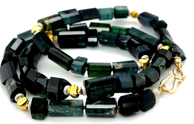 This versatile necklace features a beautiful collection of naturally occurring tourmalines in the blue, green and teal color family. The semi-transparent tourmalines have been faceted as triple-sided columns that preserve the natural crystal structure of each bead, giving them a wonderfully natural and organic feel. Slender facets catch the light to display the bright grass green, warmer olive tones, and beautiful indicolite blues, with some blended to create stunning teal hues! Ornate 18k yellow gold beads accented with 14k white gold stardust spacers contrast the organic feel of the necklace, making this strand suitable for both casual and dressier occasions. A decorative 14k yellow gold clasp finishes the necklace, giving it an overall length of 20 inches. This necklace will complement both daytime and evening attire. An exciting expression of color in your fine jewelry wardrobe is always a good thing!