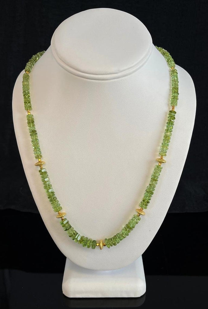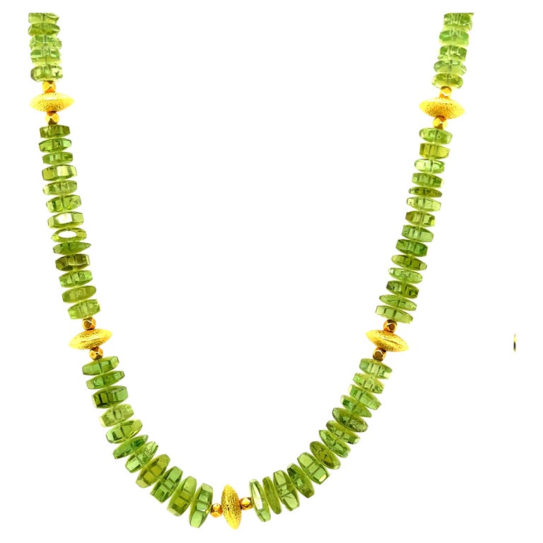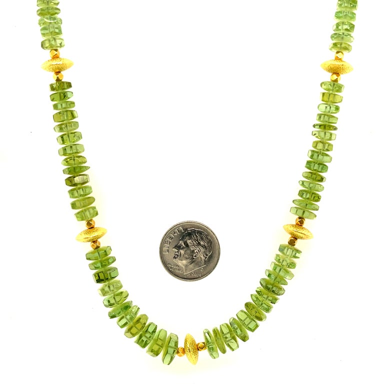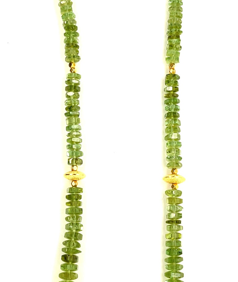 This pretty necklace features a beautiful collection of green tourmaline beads and is adjustable in length! The fine tourmaline beads have bright green color and graduate in size from 5.50 to 8.5mm in diameter. The tourmalines have been arranged with two types of lovely 18k yellow gold beads - a textured, round lentil-shaped bead and delicate 18k yellow gold faceted cubes. The rich yellow gold accents elevate this necklace to transition easily between casual and dressy occasions! A beautifully designed 18k yellow gold hook clasp includes an extender chain with links that allow the necklace to be adjusted in length between 22 and 25 inches. Strung by hand on silk thread, this is a versatile and colorful necklace that will brighten up any outfit!