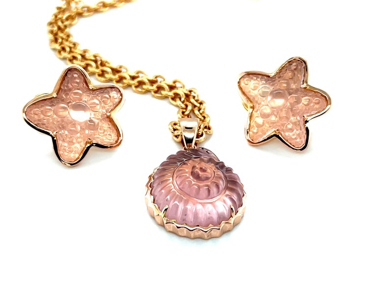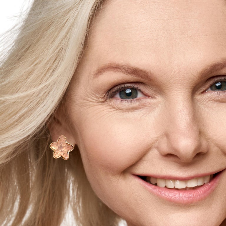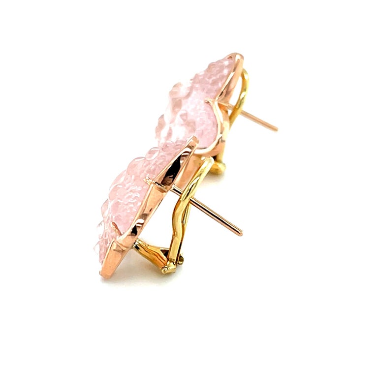 These beautiful earrings feature crystalline rose quartz gems that have been hand carved as starfish and set in 18k rose gold bezels with French clip backs. The rose quartz are a lovely "shell pink" color and they were carved with intricate, lifelike details that give the gems wonderfully eye-catching dimension. Solid 18k rose gold backings give the starfish subtle peach highlights and add an extra layer of luminescence. The earrings measure 7/8" in diameter and have posts with 18k gold French clip backs for added security and comfort. Hand carved by a Master Carver in Germany and crafted by our Master Jewelers in Los Angeles, these earrings are perfect for both day and night, and are a luxurious way to celebrate the beauty of nature!