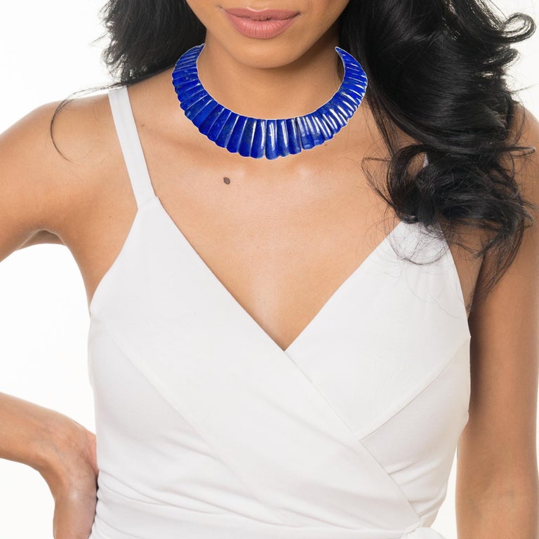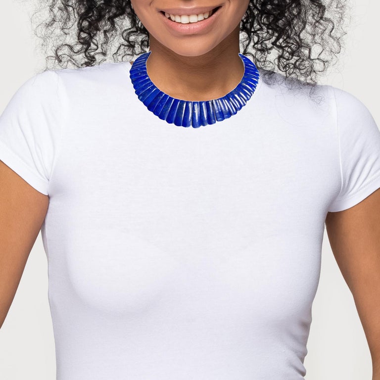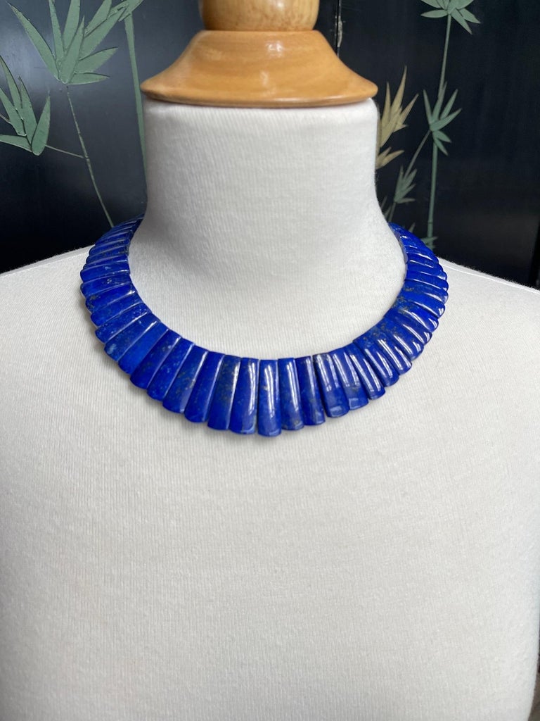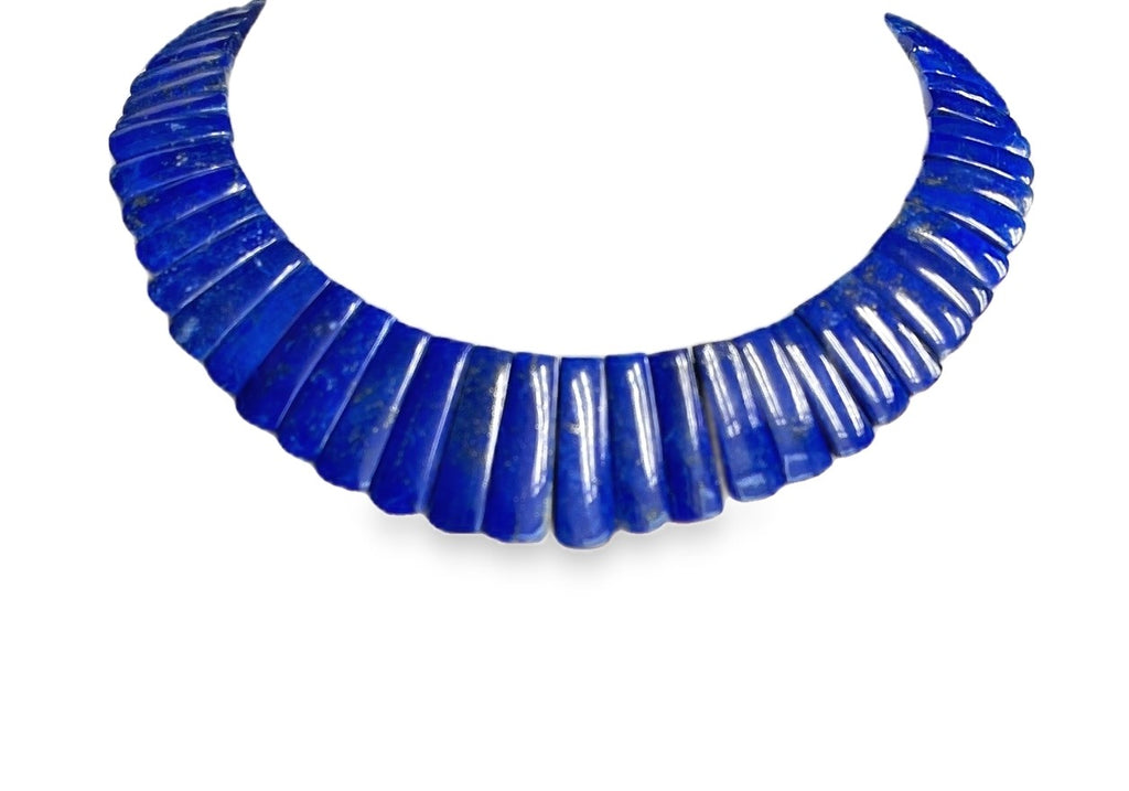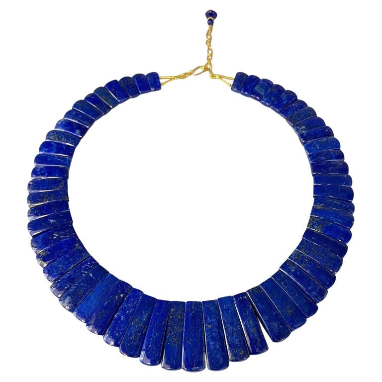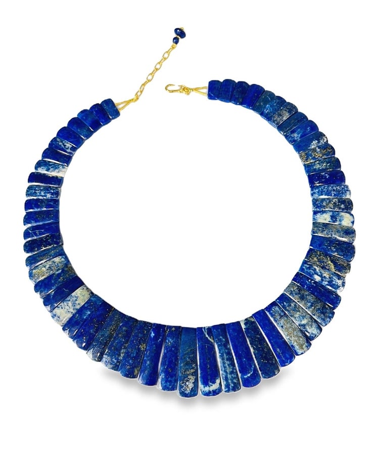 This exquisite "Cleopatra" style collar necklace features fine blue lapis lazuli tiles with an adjustable 18k yellow clasp, and is reversible! Carved in Germany, the subtly tapered, slightly curved lapis tiles have gorgeous blue body color and graduate in length from 1" in the center front to 1/2" in the center back. The lapis tiles' rich, unending blue color on one side gives the collar a stunningly dramatic, elegant appearance. The reverse side is beautifully mottled with variegated coloring for a more casual look that will complement blue greens, browns and grays particularly well. Adjustable in length from approximately 20-1/2 inches to 19 inches, this is a truly impressive statement necklace fit for a queen!