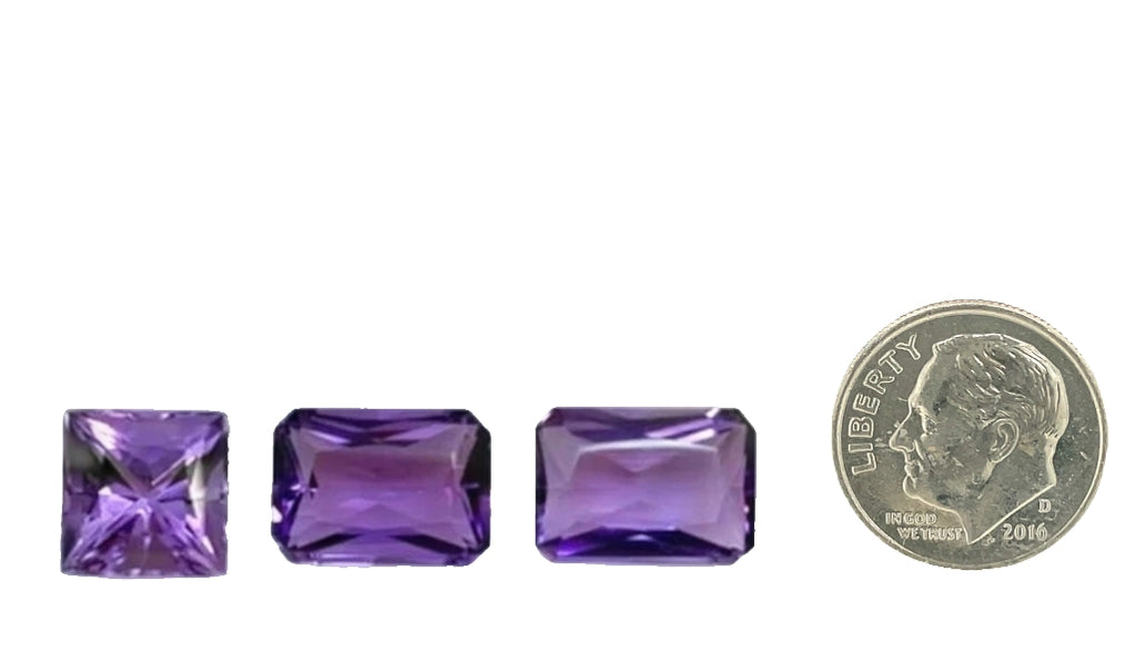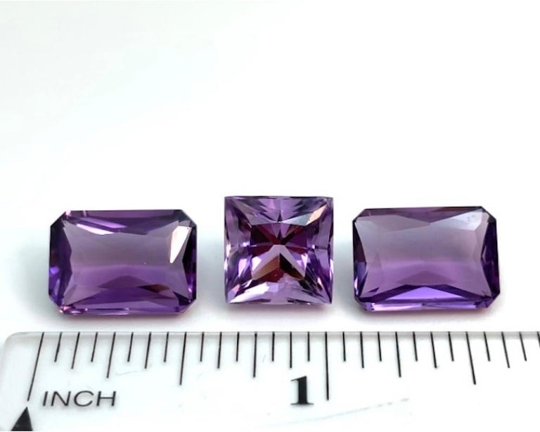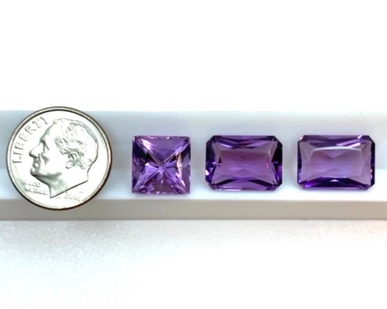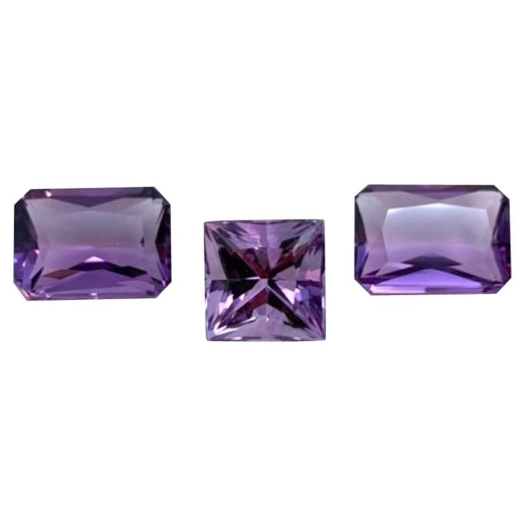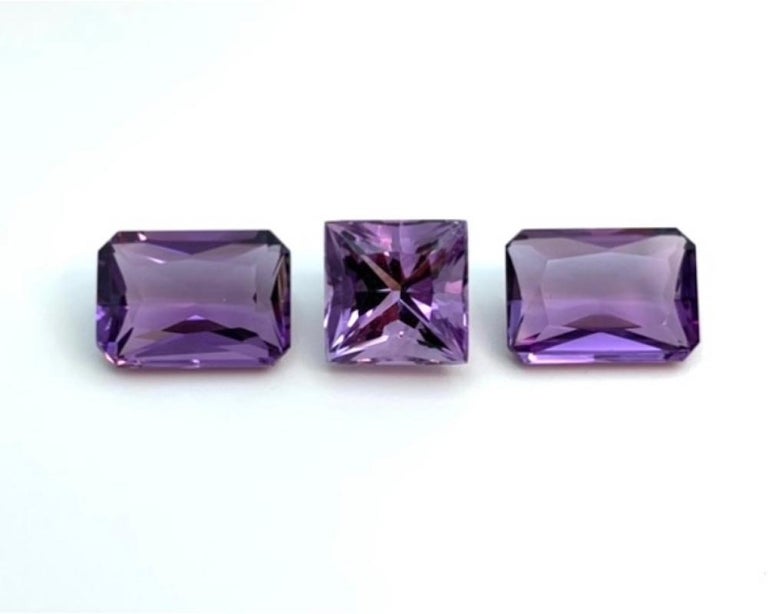 This set of loose gemstones, aka a "lot*" in the trade, has three unset amethysts: two rectangular mixed cuts and one gorgeous princess-cut! Weighing 16.90 carats in total, these gems are a lovely purple color, extremely clean and bright, with pretty, pinkish purple highlights. They would be beautiful set individually as rings, or together as a suite, perhaps a pendant with matching earrings! With your imagination, they could be anything!