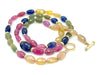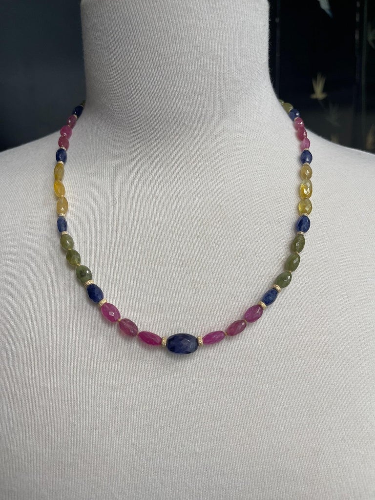 This eye-catching gemstone necklace features a beautiful collection of faceted, fancy-colored natural sapphire beads weighing over 167 carats! Warm green hues are combined with bright yellow and vivid pink hues that come to life next to the rich blues, with a large royal purple sapphire bead at the center of this gorgeous necklace. The beads are hand-strung on silk thread with yellow gold stardust beads that add sparkle and an extra touch of luxurious elegance. The 18k yellow gold toggle clasp brings the necklace to a finished length of 21.5 inches. Perfect for layering or wearing alone, this is a perfect way to bring exotic color to any outfit!