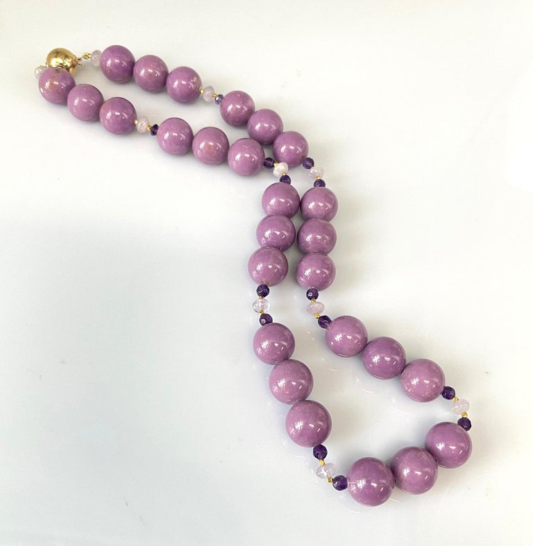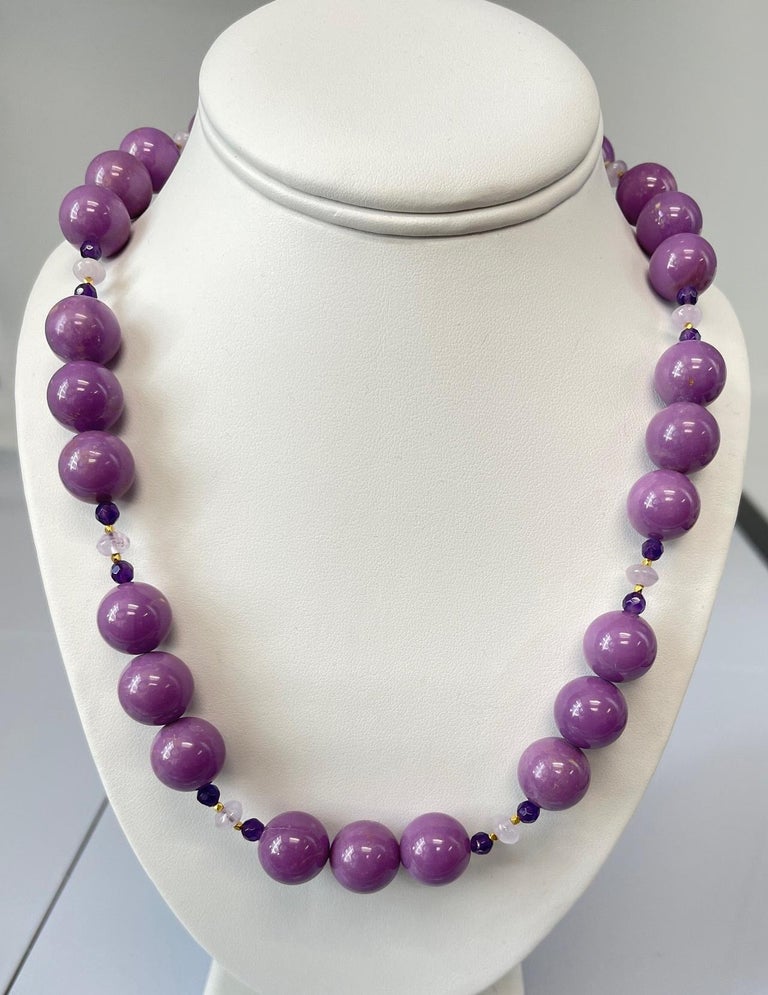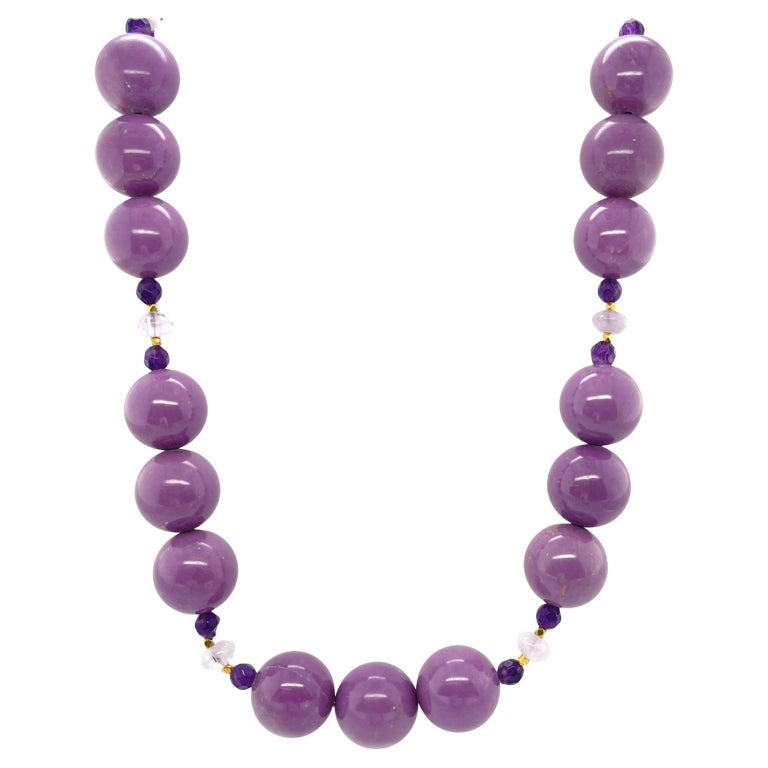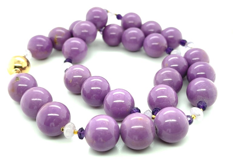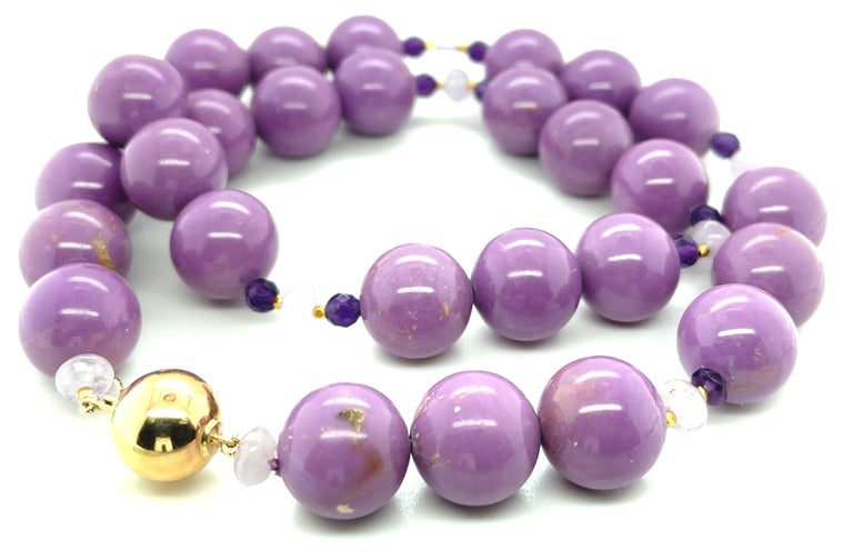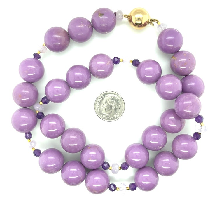 This unique necklace features a luscious collection of rare 14mm round phosphosiderite beads with gorgeous purple grape color. The uniform and perfectly matched phosphosiderite beads pair beautifully with the royal purple faceted amethyst and delicate rose-colored kunzite, and create a striking combination of colors that can be worn day or night! 18k yellow gold accent beads provide an extra touch of luxury and elevate these gems to fine jewelry status. The 14k yellow gold ball clasp is an elegant finish that brings this eye-catching necklace to a length of 20 inches. Perfect for daytime and evening wear!