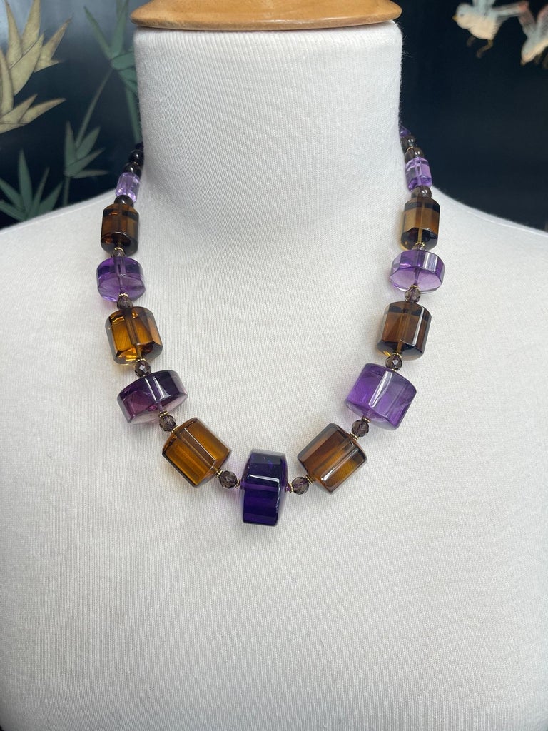 This eye-catching necklace features bold, faceted amethyst and smoky topaz barrel shaped beads beautifully arranged with 18k yellow gold accents. The large, transparent amethyst beads have gorgeous purple and lilac color and graduate in size, with the center amethyst measuring 1 inch in diameter, and the smallest measuring 5/16" in diameter. The smoky topaz barrel beads have warm coffee coloring and together with the amethyst, create a bold and sophisticated color pairing that is perfect for all seasons. Faceted round topaz beads and 18k yellow gold spacers allow each barrel bead to stand out on its own in this unique collection. The necklace is finished with polished round smoky topaz and amethyst beads and a large 18k yellow gold hook clasp that brings the finished length to 20 inches. A beautifully dramatic and bold statement necklace that is perfect for both daytime and evening wear!