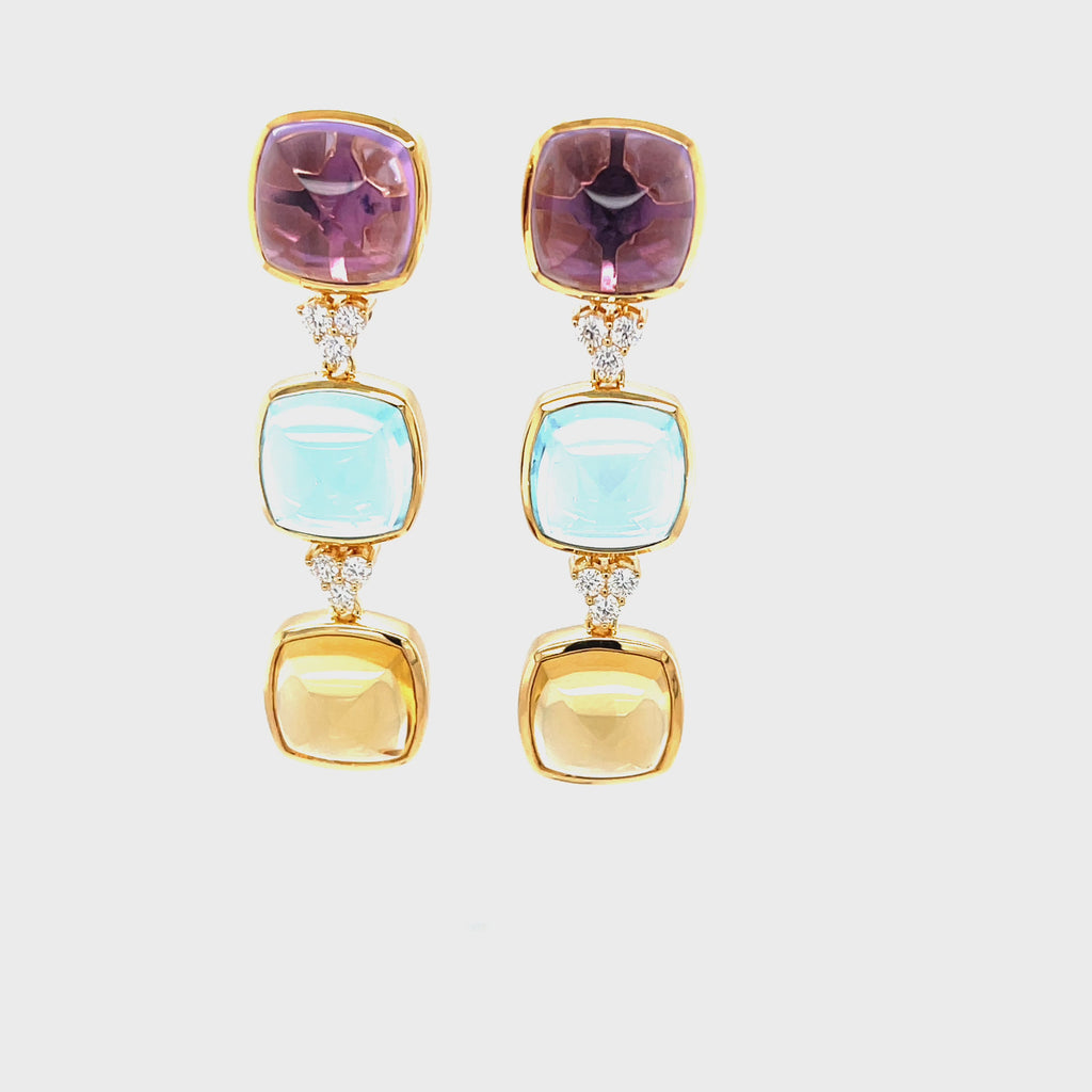 These beautiful dangle earrings feature 34 carats of colorful Swiss blue topaz, amethyst and citrine "sugarloaf" cabochons bezel set in thick 14k yellow gold with brilliant diamonds. The diamonds add sparkle and elegance, making these gorgeous earrings perfect for both daytime and evening wear. Measuring 1-3/4" in length and 7/8" in width, these fun and stylish earrings will add eye-catching color and a luxurious feel to any outfit!